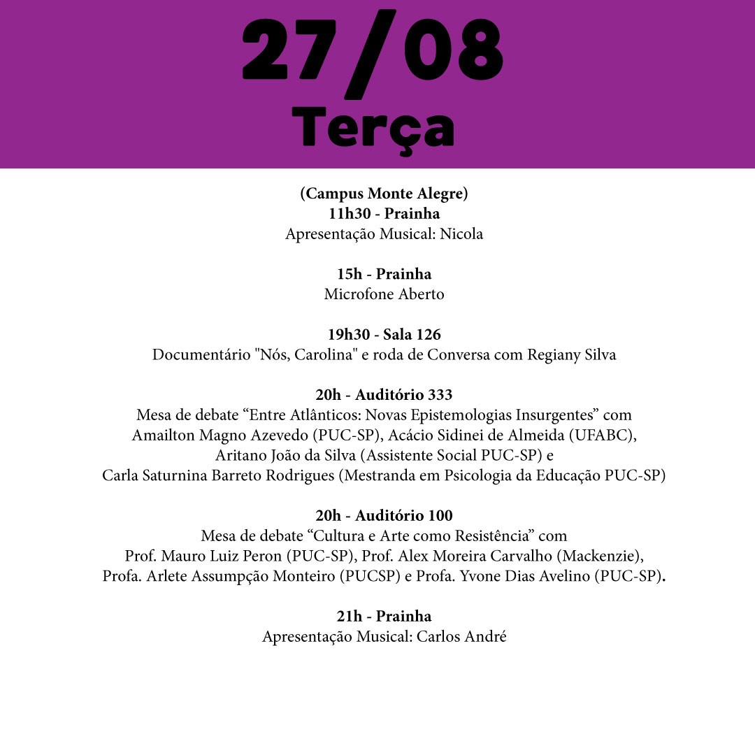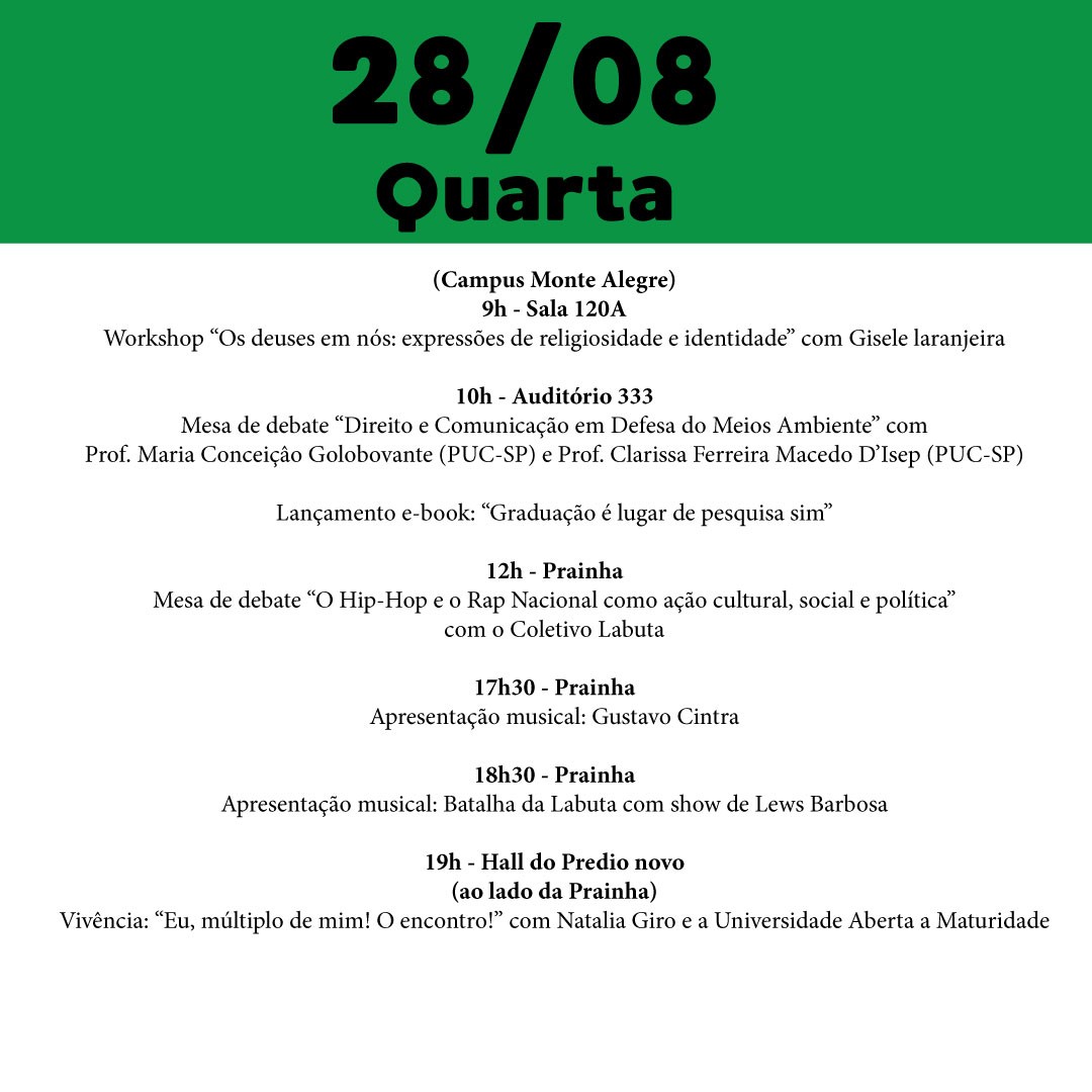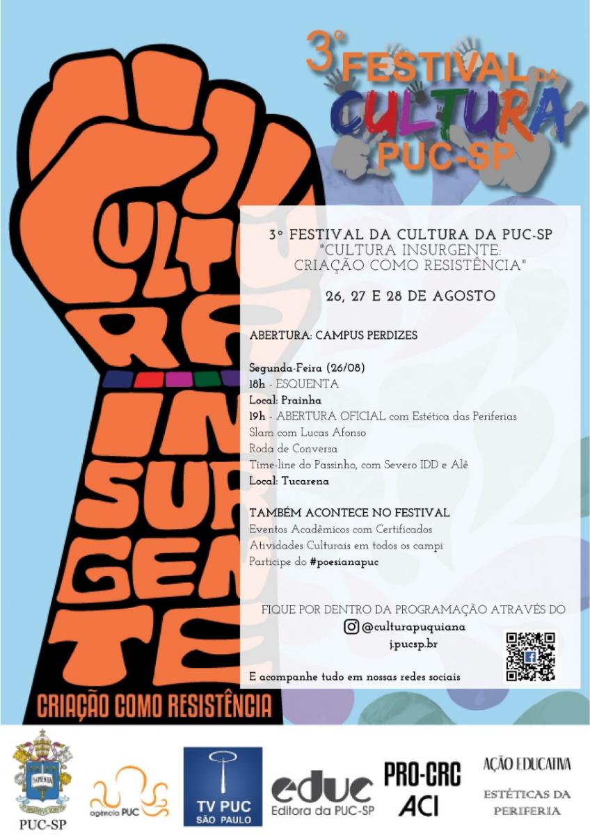Vem aí a terceira edição do Festival da Cultura da PUC-SP, que será realizada de 26 a 28/8, em todos os campi. O tema geral é Cultura insurgente: criação como resistência. Ele será abordado em três eixos de atividades:
