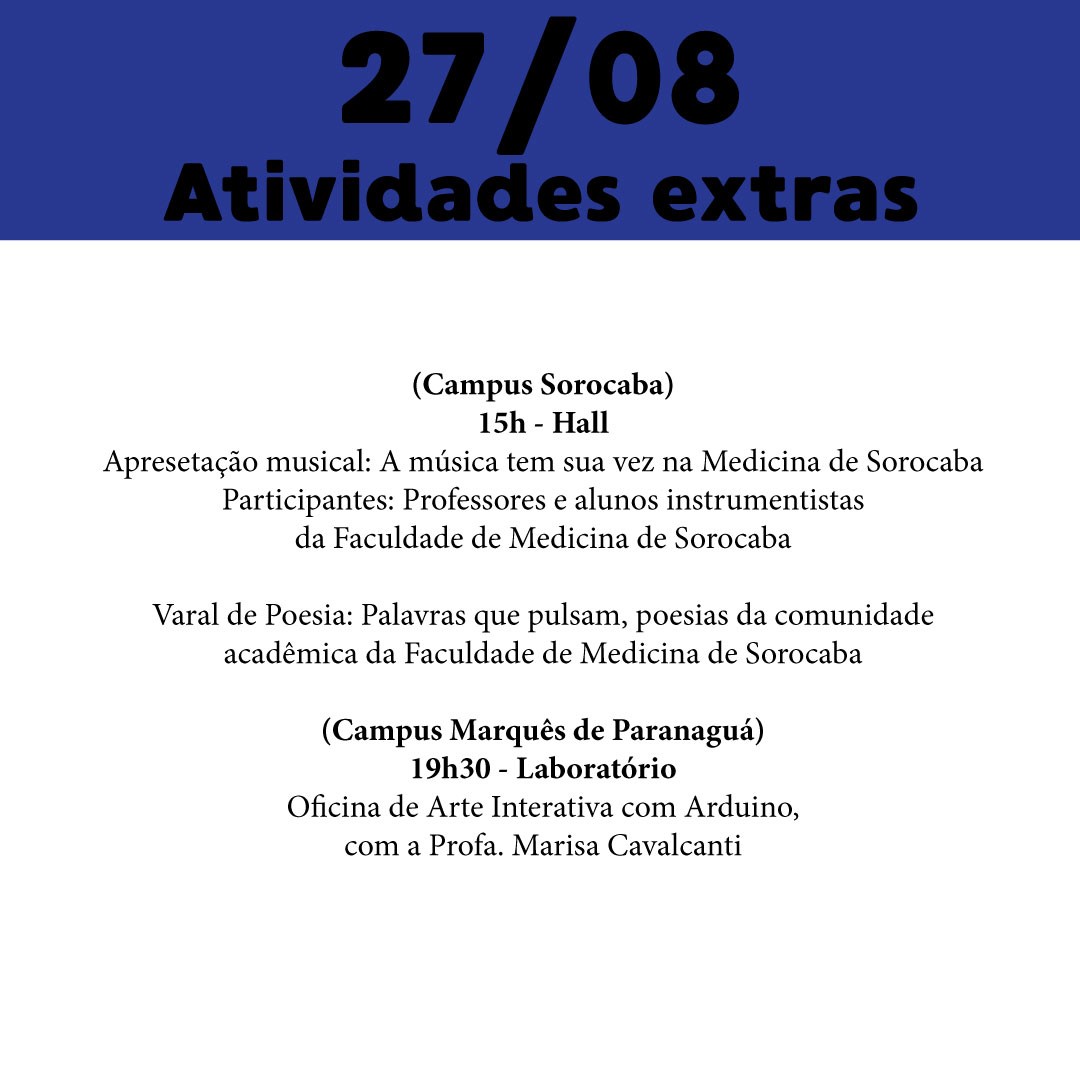 Na abertura oficial, no dia 26/8, às 19h, no Tucarena, estarão presentes a reitora Maria Amalia Andery, e a secretária-adjunta da Cultura da cidade de São Paulo, Regina Pacheco.