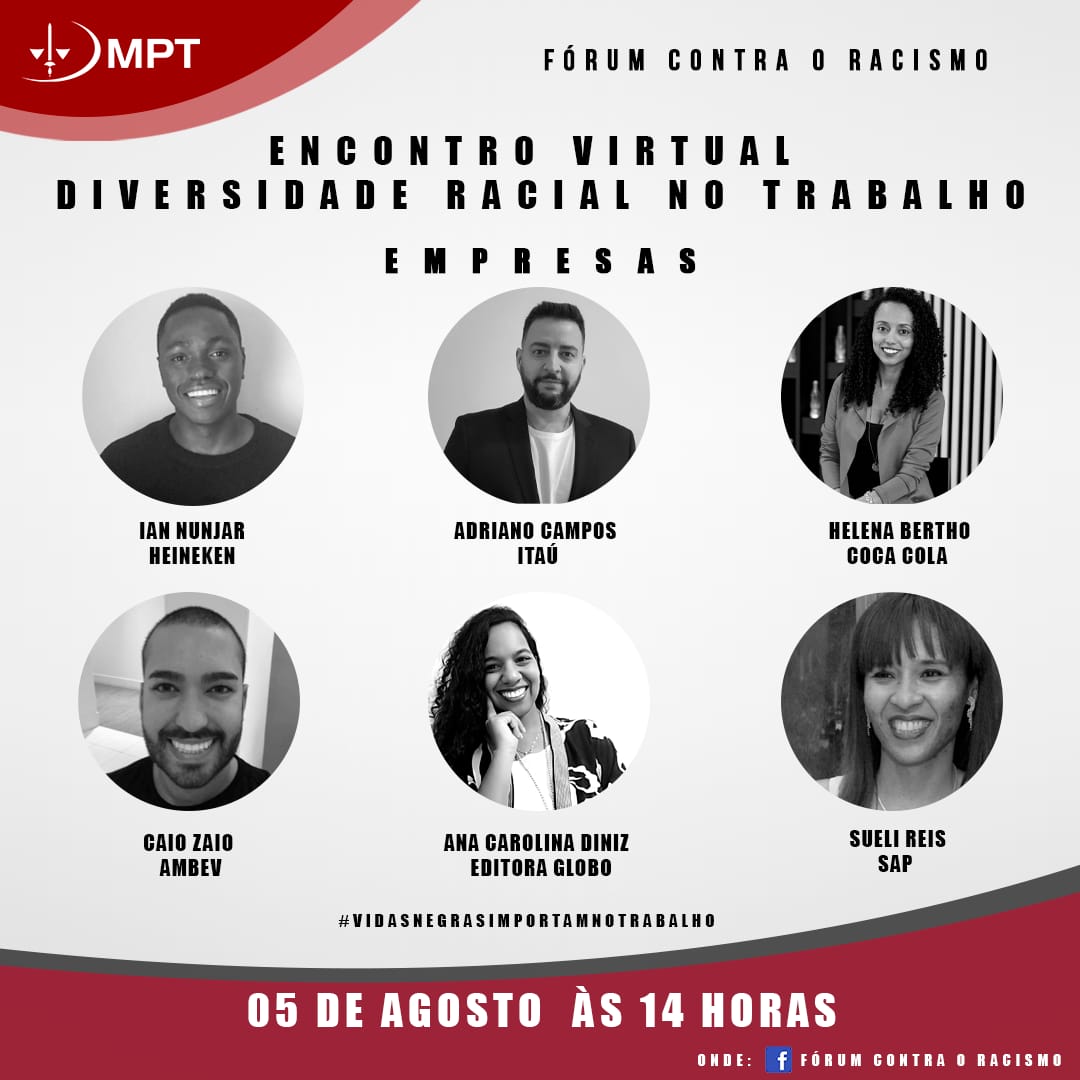 Neste dia 5/8, às 14h, se realiza o 3° Encontro - Fórum contra o Racismo Empresarial, atividade virtual sobre diversidade no trabalho em novos tempos. Adriano Campos, Ian Nunjar , Caio Zaio, Helena Bertho e Sueli Reis refletirão sobre o momento que estamos vivendo, seus desafios, as oportunidades de trabalho para jovens negras e negros no Brasil e nas empresas e seu protagonismo. Eles lideram e atuam em grandes empresas do Brasil, e o Fórum contra o Racismo e o MPT-SP trazem também Ana Carolina Diniz, jornalista da Editora Globo, para mediar e debater sobre as conquistas na temática para os jovens negras e negros do Brasil.