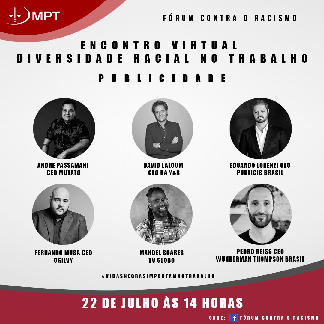 Dia 22/7, às 14h, o Fórum Contra o Racismo, com apoio da Pró-Reitoria de Cultura e Relações Comunitárias (Pró-CRC), realiza o "Encontro Virtual - Diversidade Racial no Trabalho - Publicidade".