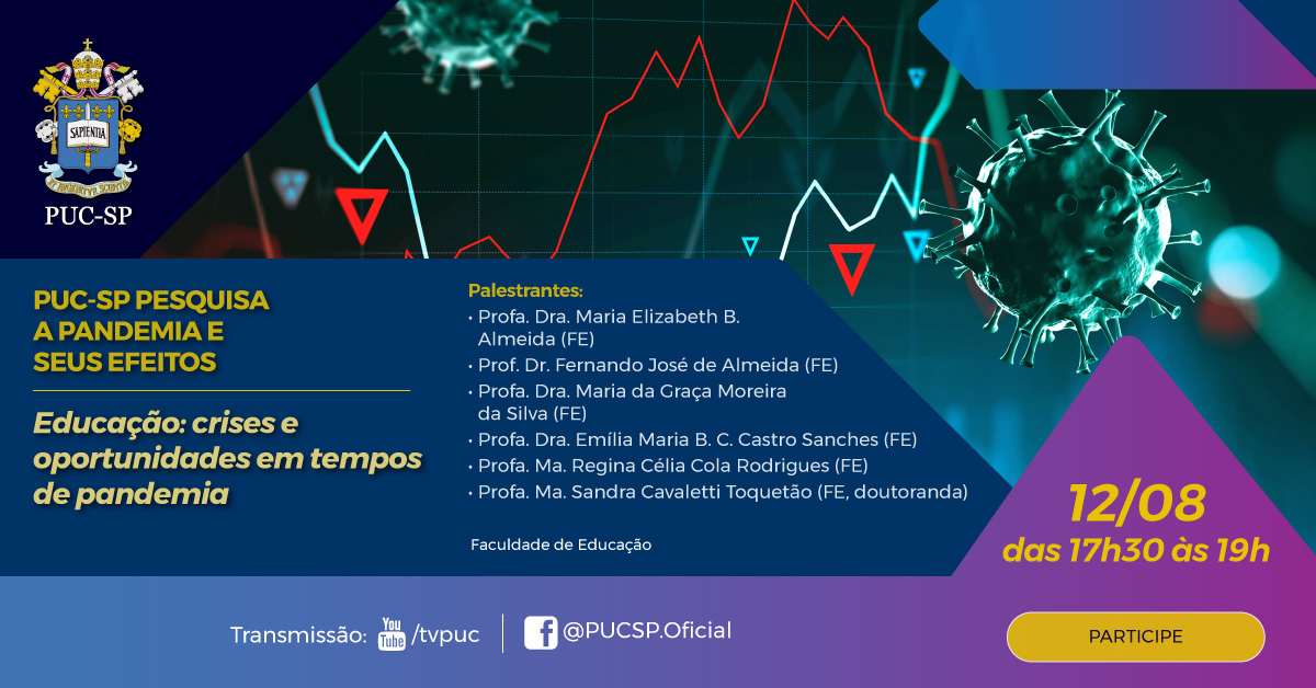 No dia 12/8, a Faculdade de Educação fala sobre "Educação: crises e oportunidades em tempos de pandemia", com a participação das professoras Maria Elizabeth Almeida, Maria da Graça Moreira da Silva, Emília Maria Castro Sanches, Regina Célia Cola Rodrigues, Sandra Cavaletti Toquetão e do professor Fernando José de Almeida. A atividade também acontece das 17h30 às 19h.