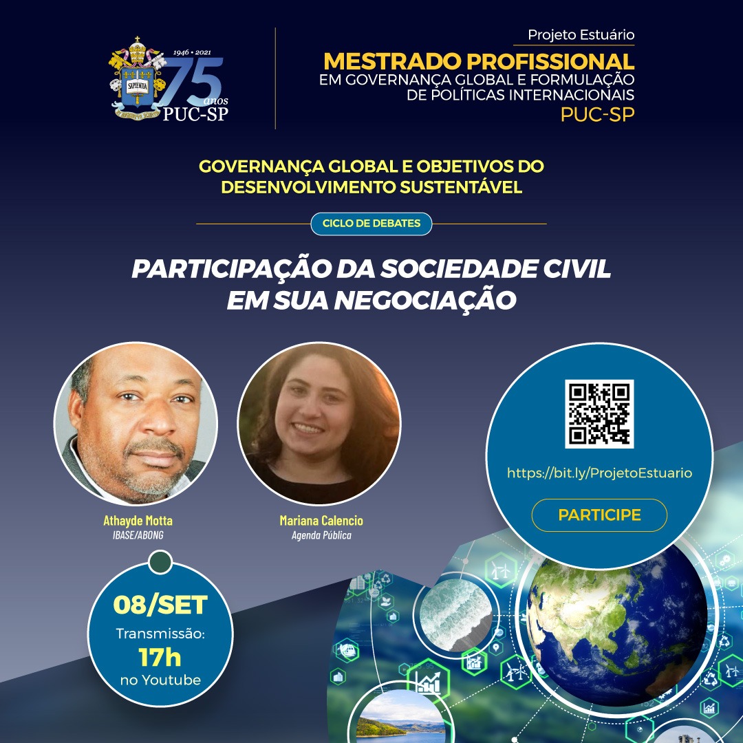 Neste dia 8/9, às 17h, começam os debates do semestre, do ciclo Governança Global e Objetivos do Desenvolvimento Sustentável. As atividades fazem parte do programa do Mestrado Profissional em Governança Global e Formulação de Políticas Internacionais da PUC-SP.