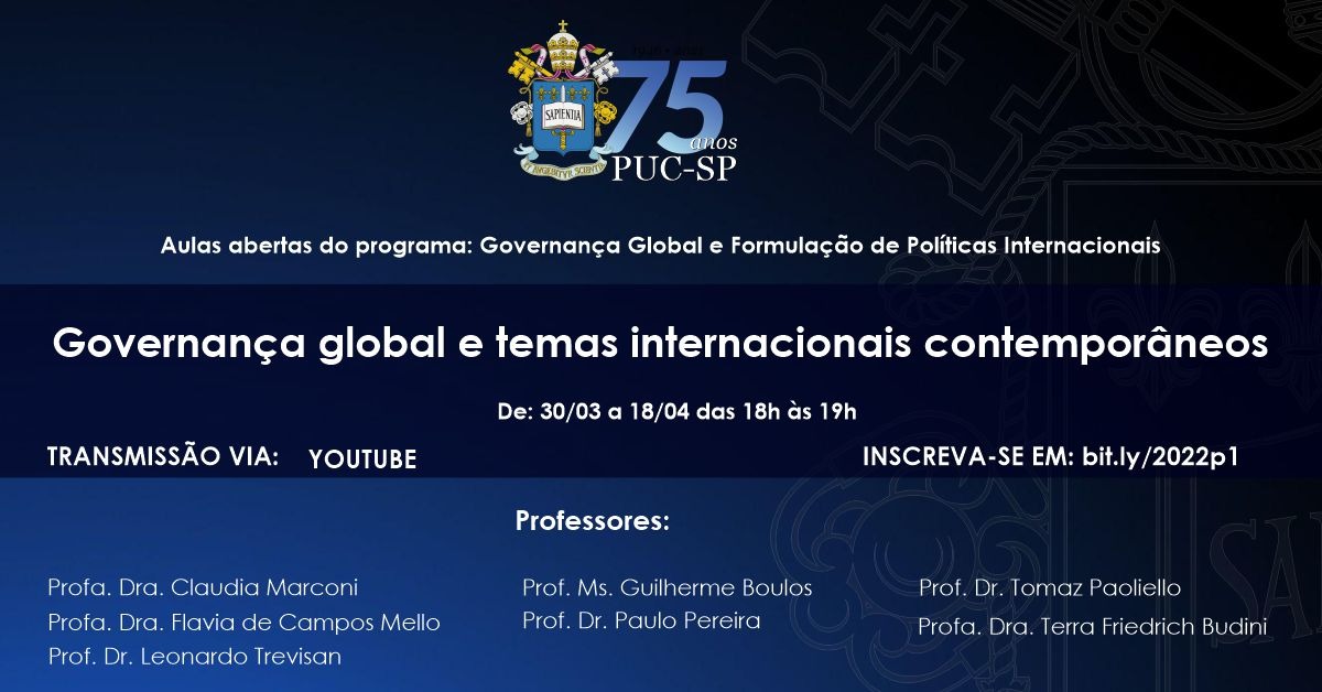 O mestrado profissional em Governança Global e Formulação de Políticas Internacionais realiza, entre os dias 30/3 e 18/4, o curso aberto, online e gratuito Governança global e temas internacionais contemporâneos.