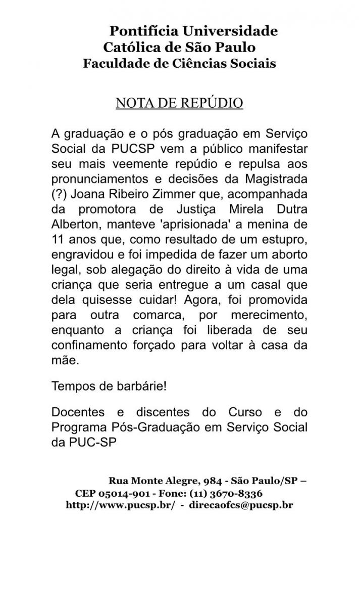 Os docentes e discentes da graduação e do Programa Pós em Serviço Social da PUC-SP divulgaram uma nota dde repúdio e repulsa aos pronunciamentos e decisões da magistrada Joana Ribeiro Zimmer que, acompanhada da promotora de Justiça Mirela Dutra Alberton, manteve 'aprisionada' a menina de 11 anos que, como resultado de um estupro, engravidou e foi impedida de fazer um aborto legal.