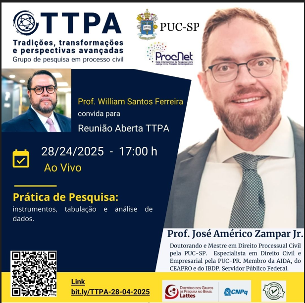 O Grupo de Pesquisas “Processo Civil: Tradições, transformações e perspectivas avançadas” (TTPA / PUC-SP), liderado pelo Prof. William Santos Ferreira (Fac. Direito), receberá em Reunião Aberta on-line, dia 28/4, às 17h, o prof. José Américo Zampar Jr.