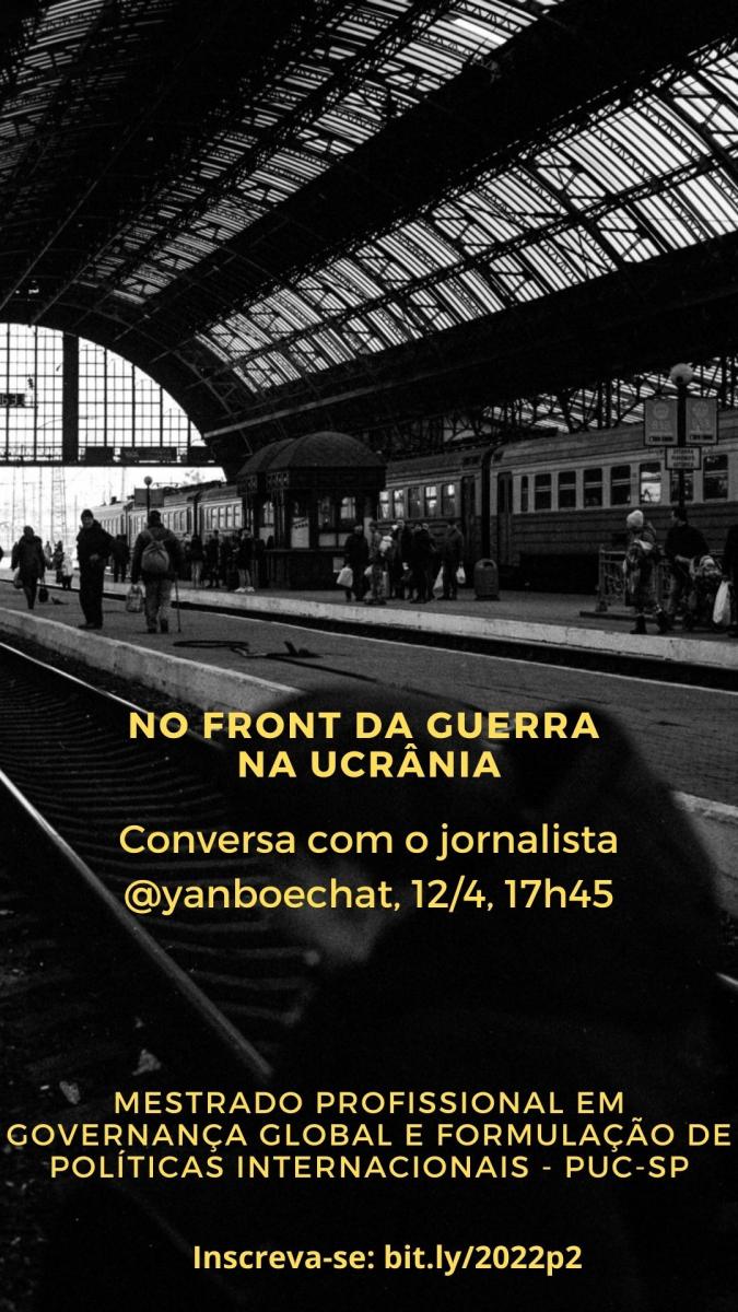 Na próxima terça-feira, dia 12/4, às 17h45, o Mestrado Profissional em Governança Global e Formulações de Políticas Internacionais da PUC-SP promove uma conversa com o aluno e jornalista Yan Boechat, com o tema "No Front da Guerra na Ucrânia". O profissional de imprensa, que é especialista na cobertura de conflitos internacionais, esteve na Ucrânia cobrindo o conflito.
