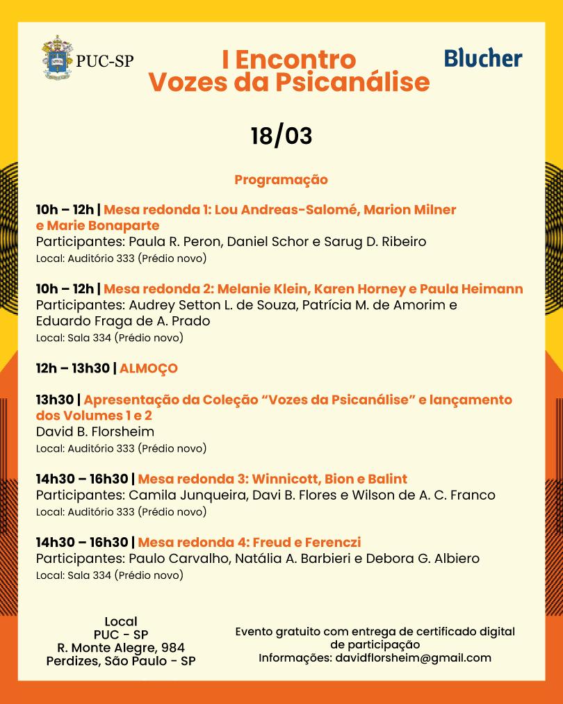 Dia 18/3, às 9h, acontece o I Encontro Vozes da Psicanálise, no auditório 333 (3º andar, prédio novo, campus Monte Alegre). O objetivo é apresentar ao público conceitos de diferentes autores da psicanálise e promover a diversidade dessa disciplina.