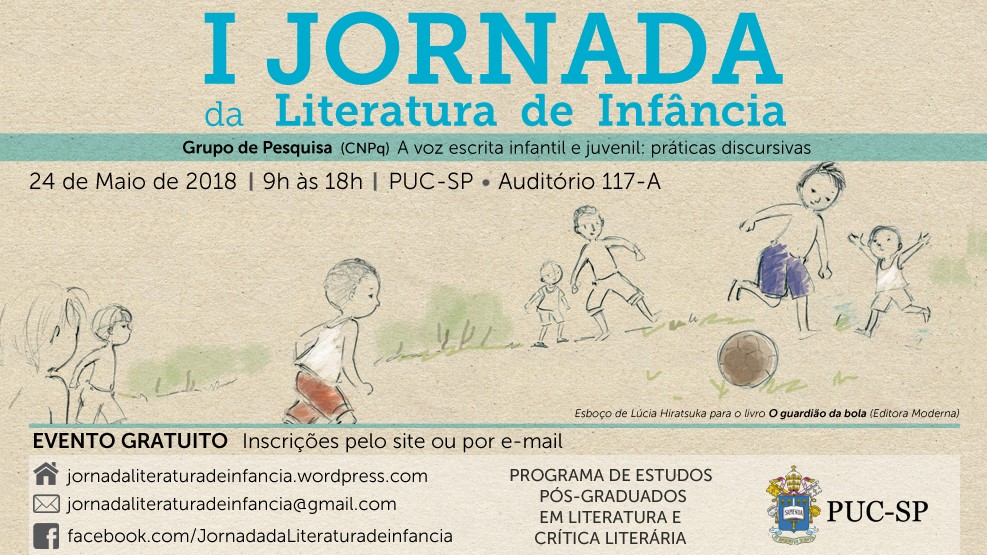 Dia 24/5, às 9h, acontece a I Jornada da Literatura de Infância, com o objetivo é refletir sobre a linguagem infantil na literatura. A atividade será realizada pelo grupo de pesquisa “A voz escrita infantil e juvenil: práticas discursivas” (Pós em Literatura e Crítica Literária), no campus Monte Alegre, sala 117-A (1º andar, prédio novo). Para se inscrever, clique aqui.