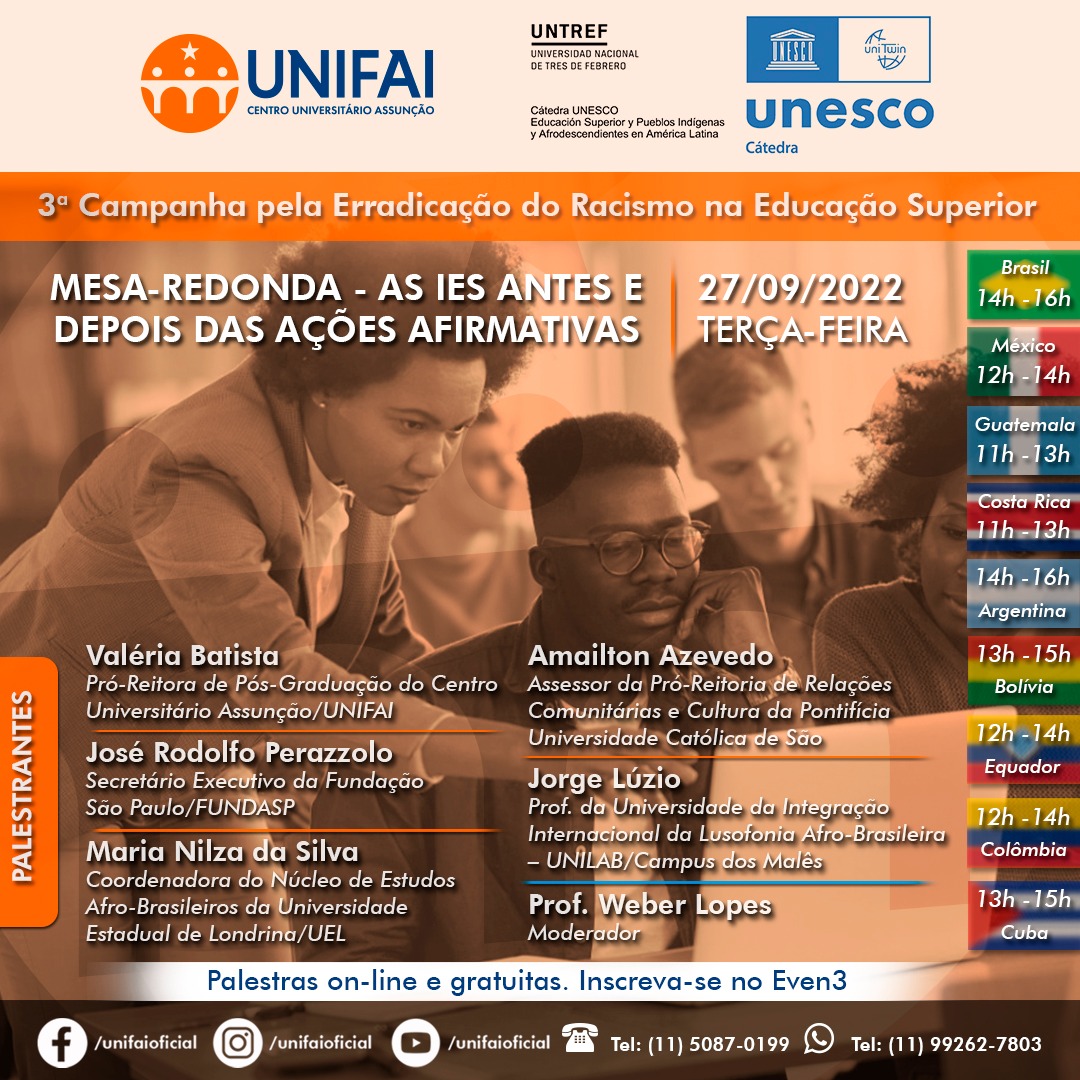 Neste dia 27/9, à 14h, o secretário Executivo da Fundação São Paulo, pe. Rodolpho Perazollo, o prof. Amailton Azevedo, assessor da Pró-Reitoria de Cultura e Relações Comunitárias (PróCRC), e a Pró-Reitora de Pós-Graduação da Unifai, profa. Valéria Batista, participam da mesa-redonda As IES antes e depois das ações afirmativas.