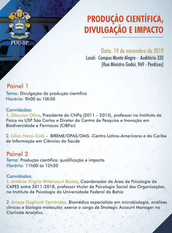 Dia 19/11, a partir das 9h, a PUC-SP realiza o evento Produção científica, divulgação e impacto. A atividade é aberta a todos os interessados e será realizada no campus Monte Alegre, auditório 333 (3º andar, prédio novo).