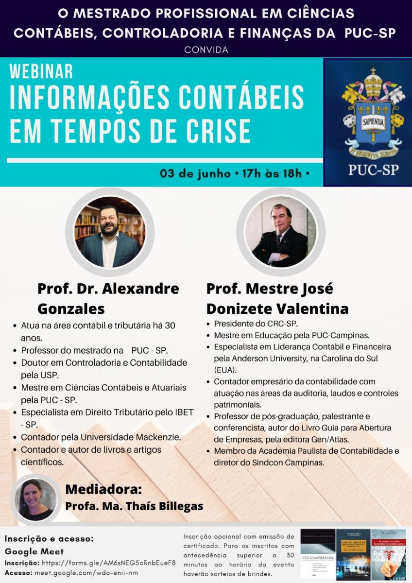 O Pós em Ciências Contábeis, Controladoria e Finanças realiza evento online, dia 3/6, às 17h, um debate online sobre Informações contábeis em tempos de crise.
