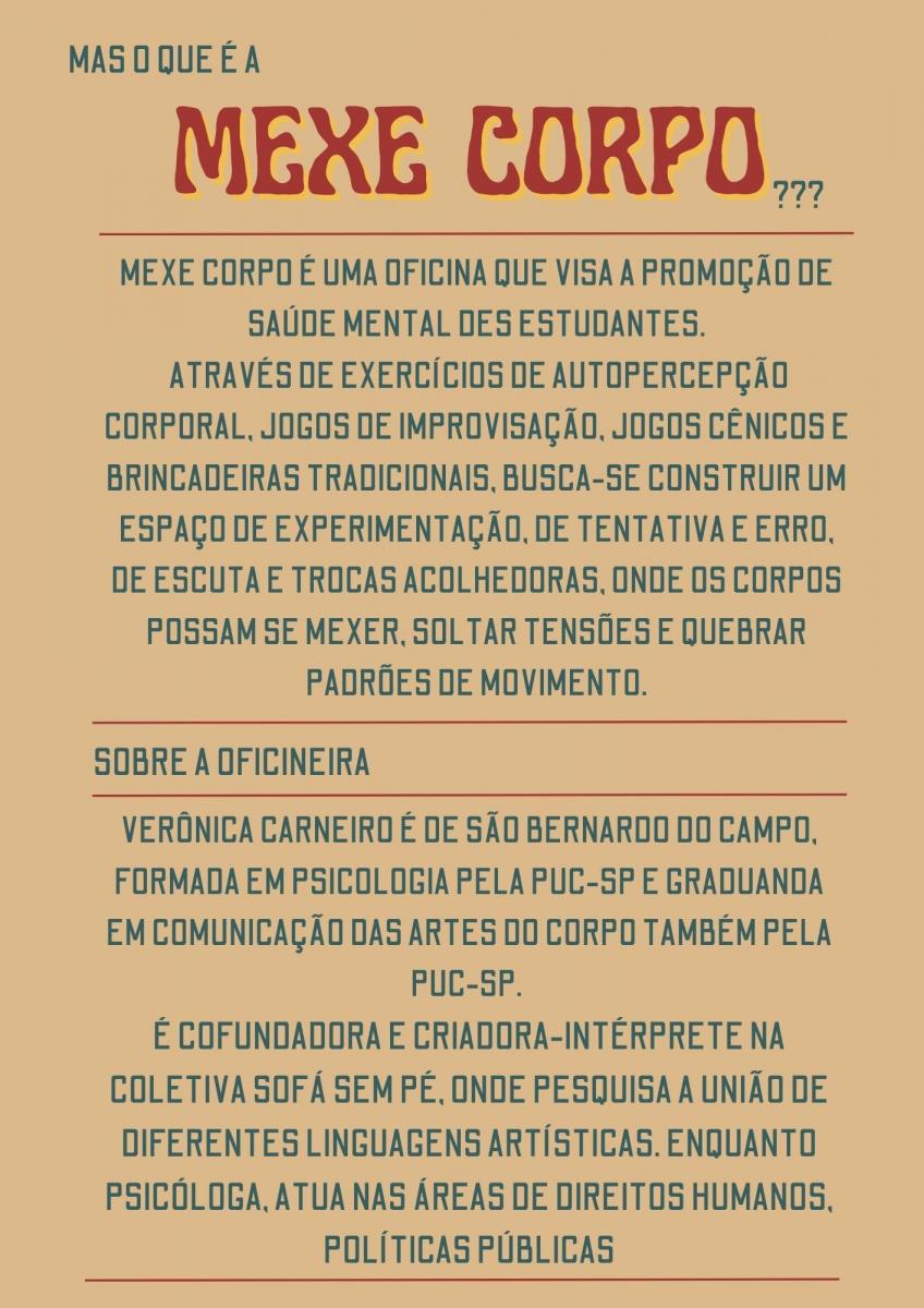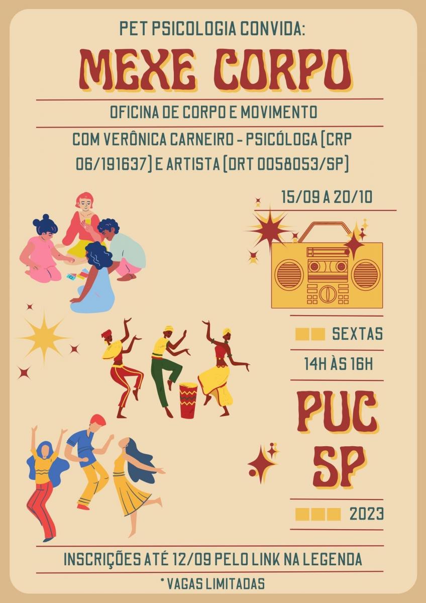 Estão abertas as inscrições para a oficina Mexe Corpo, um espaço articulado pelo PET/Psicologia à comunidade Universitária. O objetivo é promover saúde mental através da arte, do jogo e da cultura.