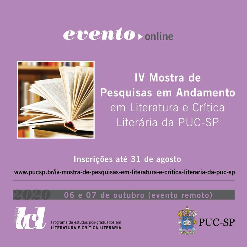 Até 31/8, estão abertas as inscrições para a IV Mostra de Pesquisas em Literatura e Crítica Literária da PUC-SP, realizada pelo Pós em Literatura e Crítica Literária.