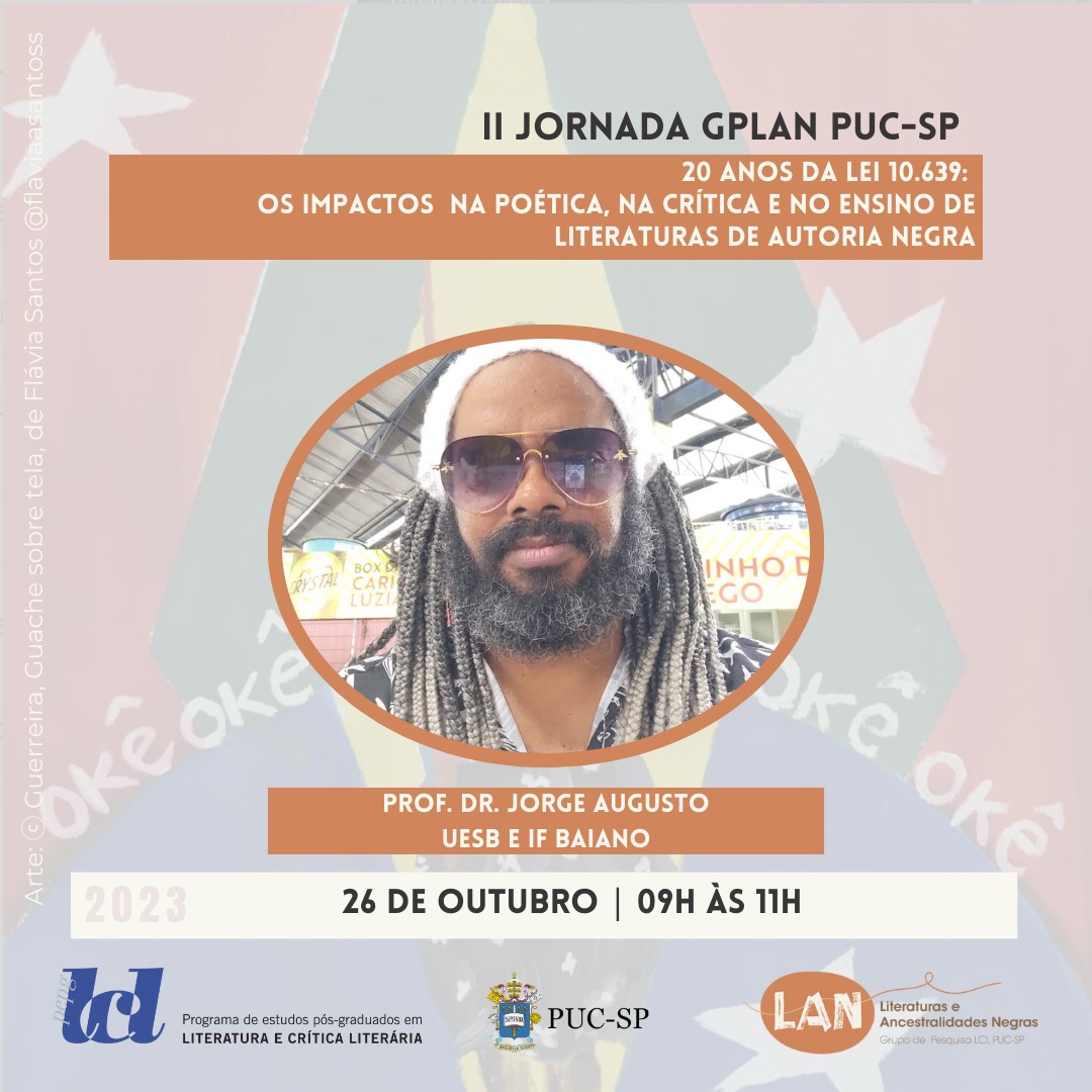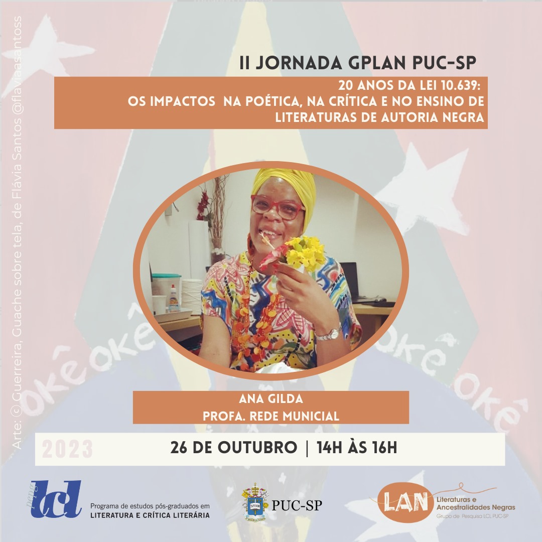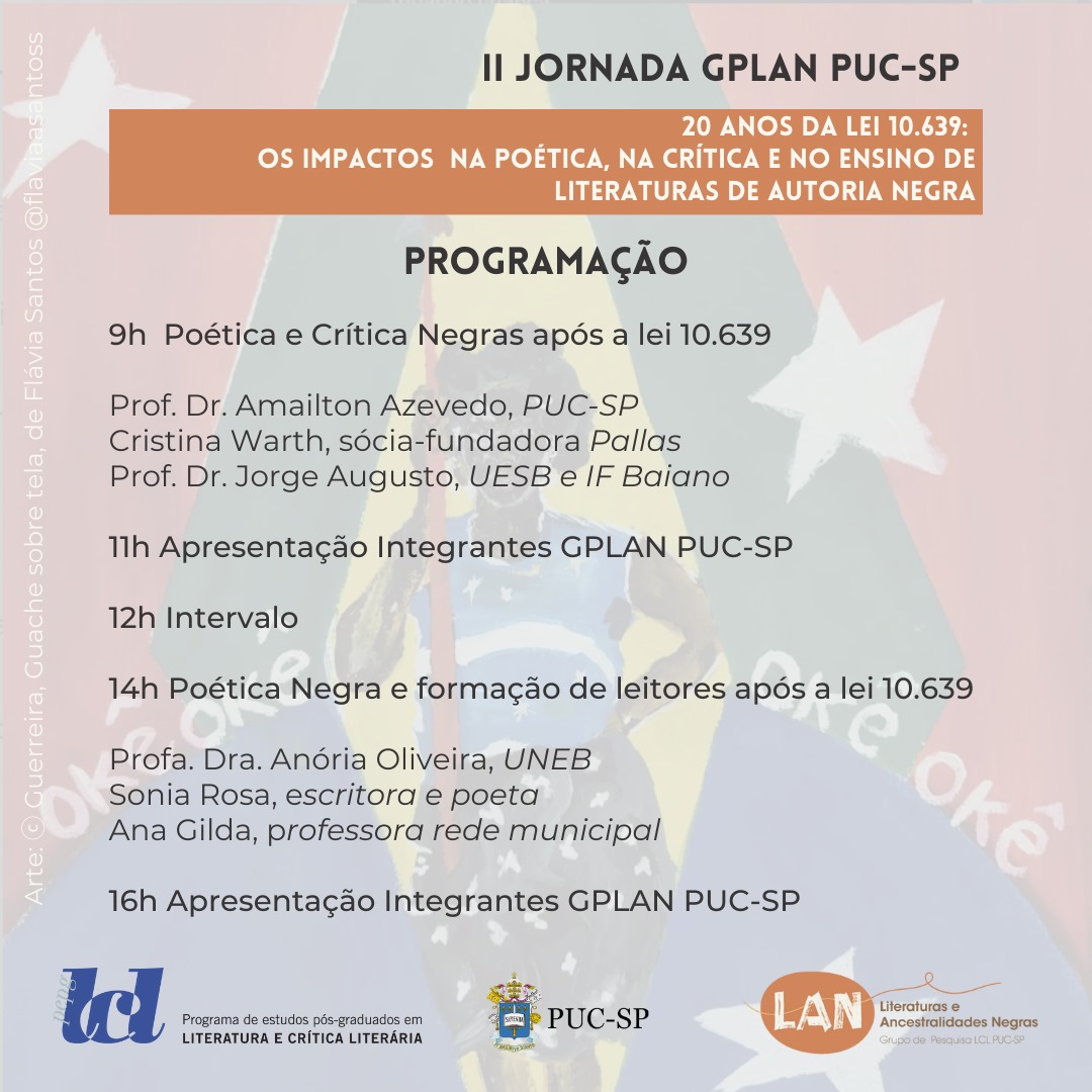 O Grupo de Pesquisa Literaturas de Ancestralidade Negra (Glan, Pós em Literatura e Crítica Literária) realiza a II Jornada de Literatura de Ancestralidade Negra, com o tema 20 anos da lei 10.639: os impactos na poética, na crítica e no ensino de literaturas de autoria negra.
