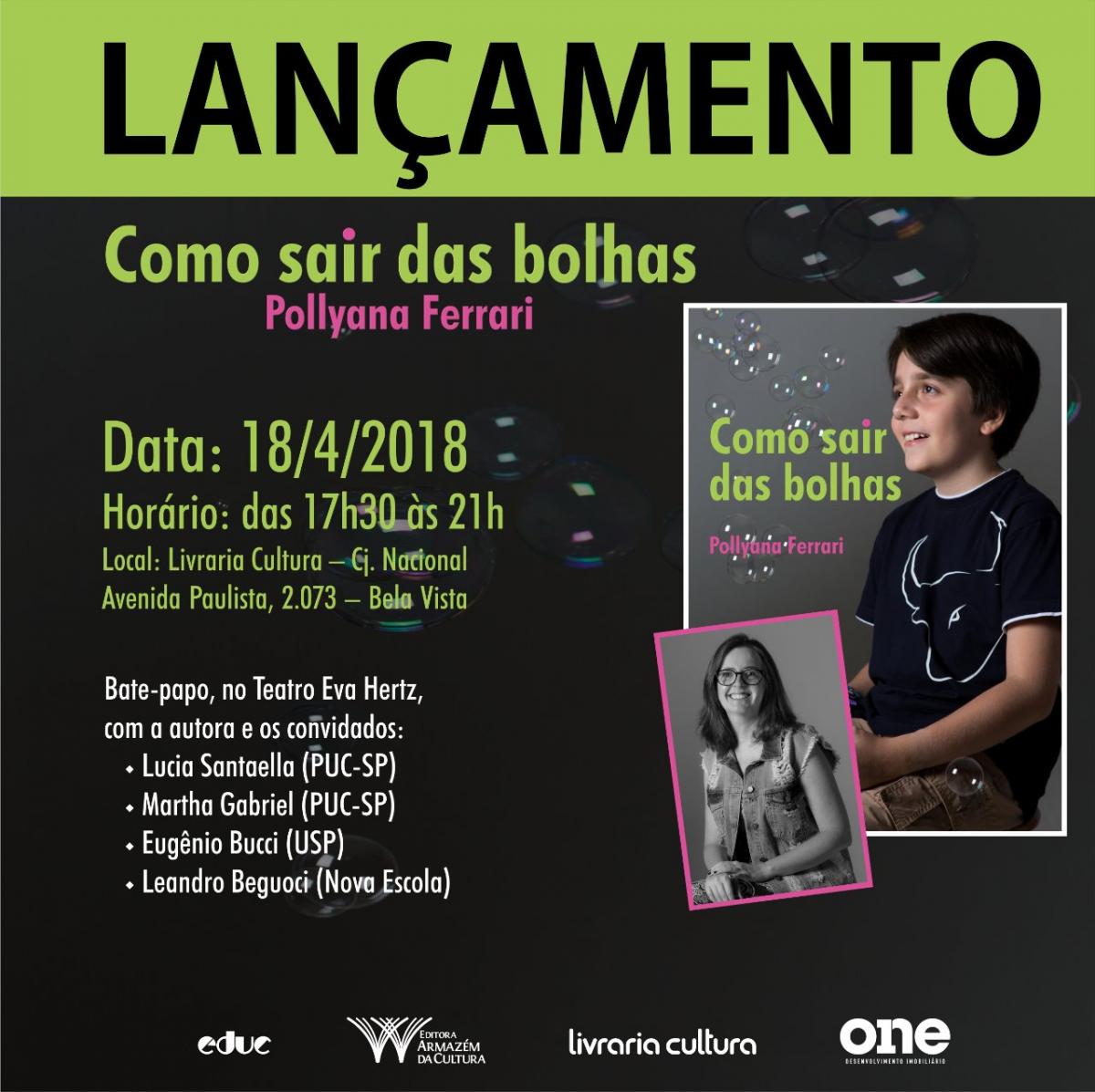 "Como sair das bolhas", novo livro da jornalista e professora da PUC-SP Pollyana Ferrari, será lançado dia 18/4, na Livraria Cultura do Conjunto Nacional. A partir das 17h30, a autora participa de um bate-papo com os convidados Lucia Santaella (PUC-SP), Martha Gabriel (PUC-SP), Eugênio Bucci (USP) e Leandro Beguoci (revista Nova Escola). Em seguida, será realizado o lançamento da obra, que fala sobre fake news, educação, pós-verdade e checagem de fatos.