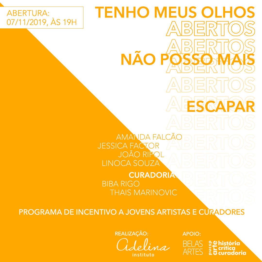 A exposição Tenho meus olhos abertos, não posso mais escapar, estreia dia 7/11, às 19h, na Adelina Instituto, situado em Perdizes, próximo ao campus Monte Alegre. Biba Rigo e Thais Marinovic, formados na graduação em Arte, Crítica e Curadoria, participam do projeto como curadores. "É uma oportunidade muito interessante para recém-formados passarem por uma experiência profissional de curadoria, em contato com artistas da mesma geração. Biba e Thais puderam acompanhar todo o processo de construção de novas obras", afirma o prof. Cauê Alves, coordenador do curso da PUC-SP. "Essa é a primeira edição, mas já estamos trabalhando na programação de 2020", ressalta o docente.