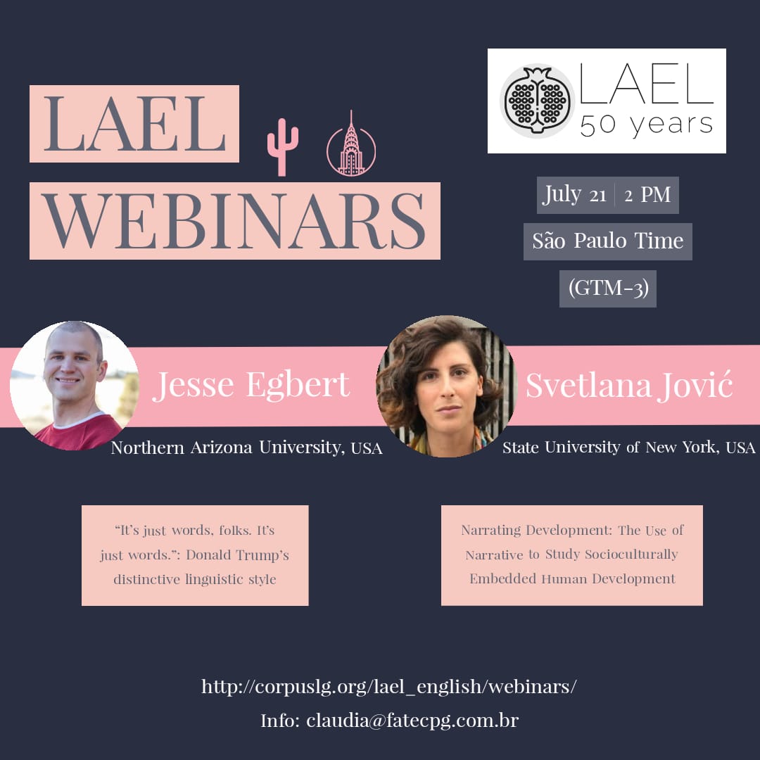 Dentro da programação dos 50 anos do Pós em Linguística Aplicada e Estudos da Linguagem (Lael), dia 21/7, às 14h, acontece uma webinar com Jesse Egbert (Northern Arizona University) e Svetlana Jovic (State University of New York). Veja na imagem como participar.