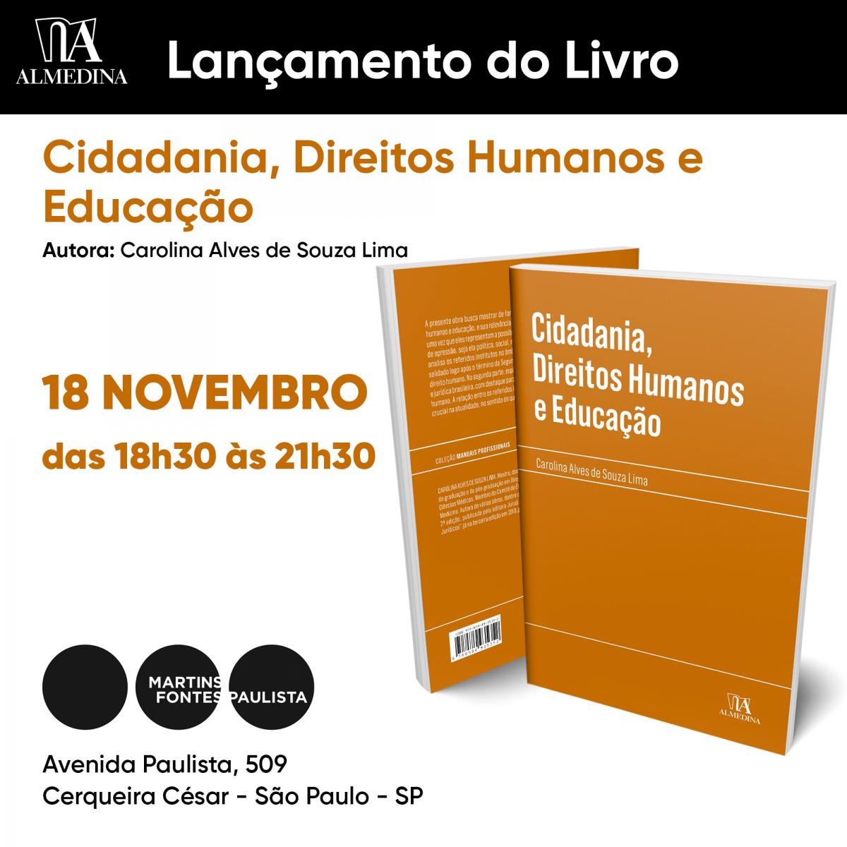 A profa. Carolina Alves de Souza Lima (Fac. de Direito) lança, dia 18/11, às 18h30, o livro Cidadania, direitos humanos e educação. O evento acontece na Martins Fontes Paulista.