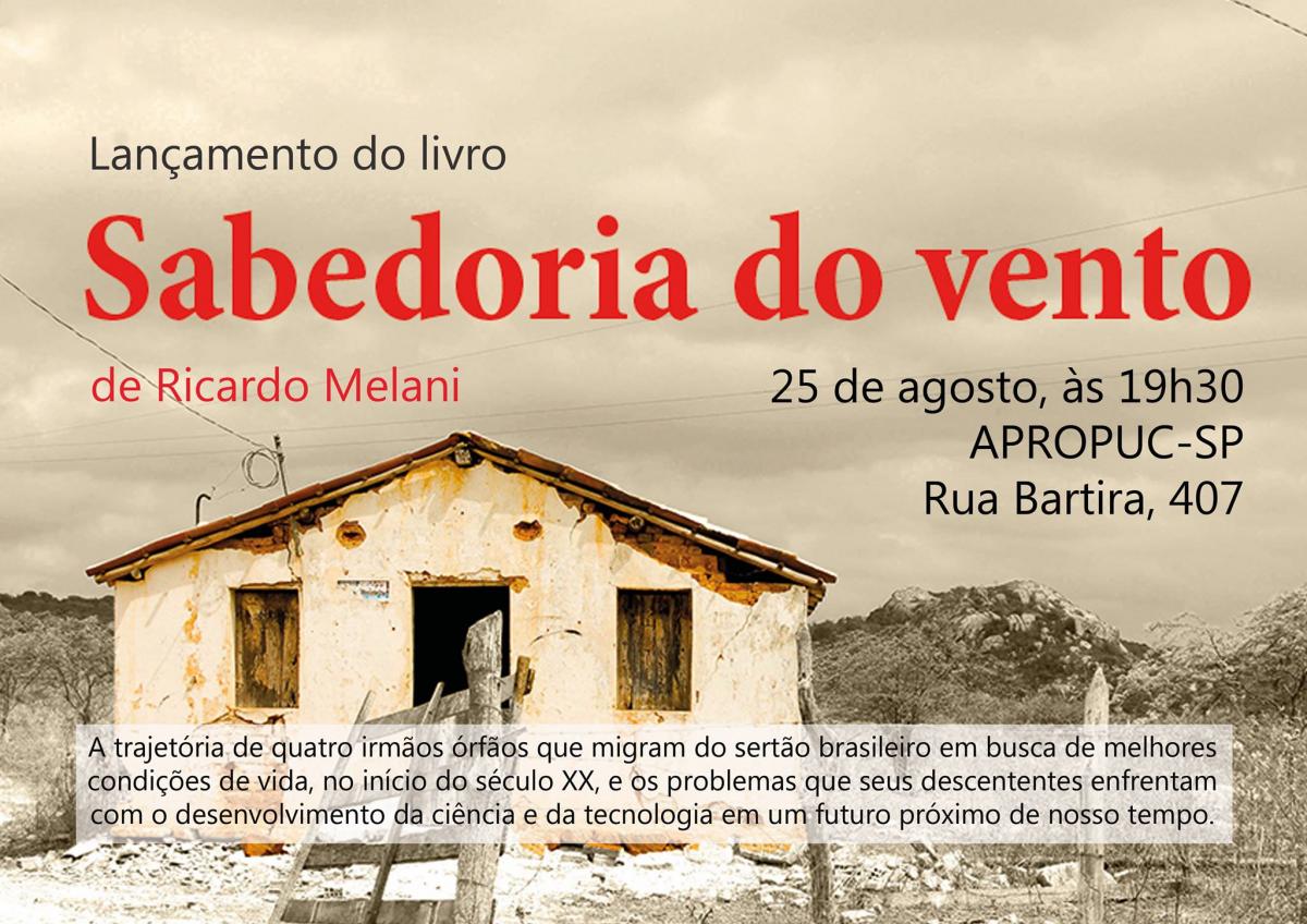 Ricardo Melani (ex-professor da PUC-SP) lança seu primeiro livro de ficção no próximo dia 25/8, às 19h30, na sede da Apropuc (rua Bartira, 407). Sabedoria do Vento (ed. Flor do Lácio) narra a história de quatro irmãos à procura de humanidade, no sertão agreste brasileiro, durante as primeiras décadas do século 20. Segundo o autor, a obra trata de temas universais morte, felicidade, liberdade e livre-arbítrio.