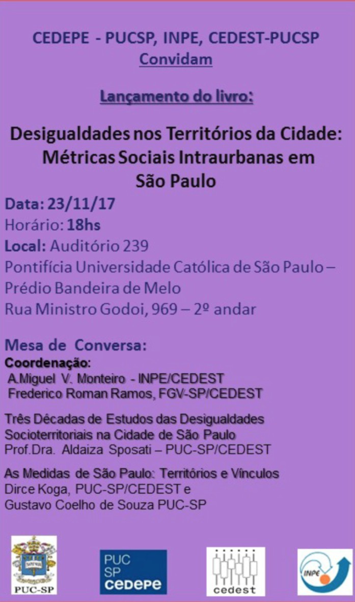 Dia 23/11, às 18h, será realizado o lançamento do livro Desigualdades nos Territórios da Cidade: Métricas Sociais Intraurbanas em São Paulo. O evento também contará com uma mesa de conversa. Veja os temas e os participantes na imagem abaixo.