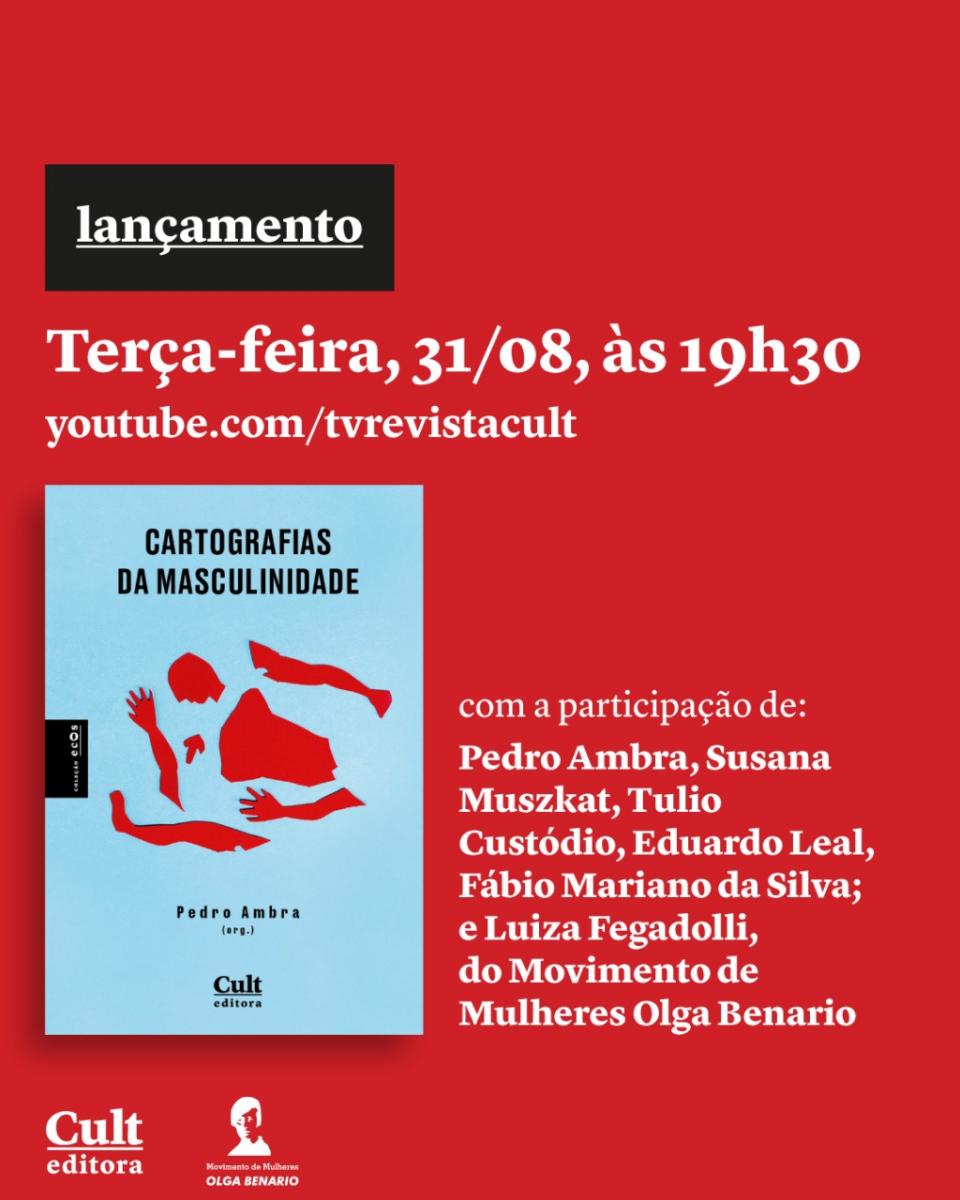 No dia 31/8, às 19h30, acontece o lançamento online do livro “Cartografias da Masculinidade" (Ed. Cult), do prof. Pedro Ambra (Fac. de Psicologia). O evento será transmitido pelo canal do YouTube da Revista Cult: www.youtube.com/tvrevistacult . Todo o valor referente aos direitos autorais do livro será revertido para o Movimento de Mulheres Olga Benário: www.instagram.com/movimentoolga.
