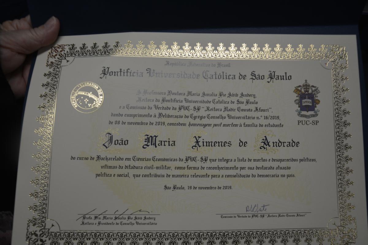 A Comissão da Verdade Reitora Nadir Gouvêa Kfouri e a PUC-SP realizaram na terça-feira (19/11) a diplomação simbólica de João Maria Ximenes de Andrade, estudante da Universidade desaparecido durante a ditadura militar, em 1974.