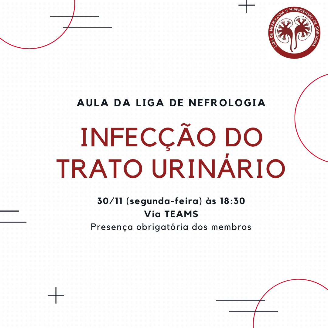 A Liga de Nefrologia da Faculdade de Ciências Médicas e da Saúde (FCMS) promoverá no próximo dia 30/11, às 18h30, uma aula especial sobre infecção do trato urinário, ministrada pela nefrologista Samirah Abreu Gomes.