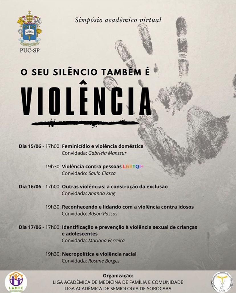 As Ligas Acadêmicas de Medicina da Família e Comunidade e de Semiologia, da Faculdade de Ciências Médicas e da Saúde (FCMS), realizarão entre 15 e 17 de junho, sempre das 17h às 19h30, o simpósio "O seu silêncio também é violência”. A atividade será realizada dentro da plataforma Teams e limitada a 200 participantes. O detalhamento para a inscrição está no final deste texto. Clique aqui para ver reportagem da mídia local que destaca o evento.
