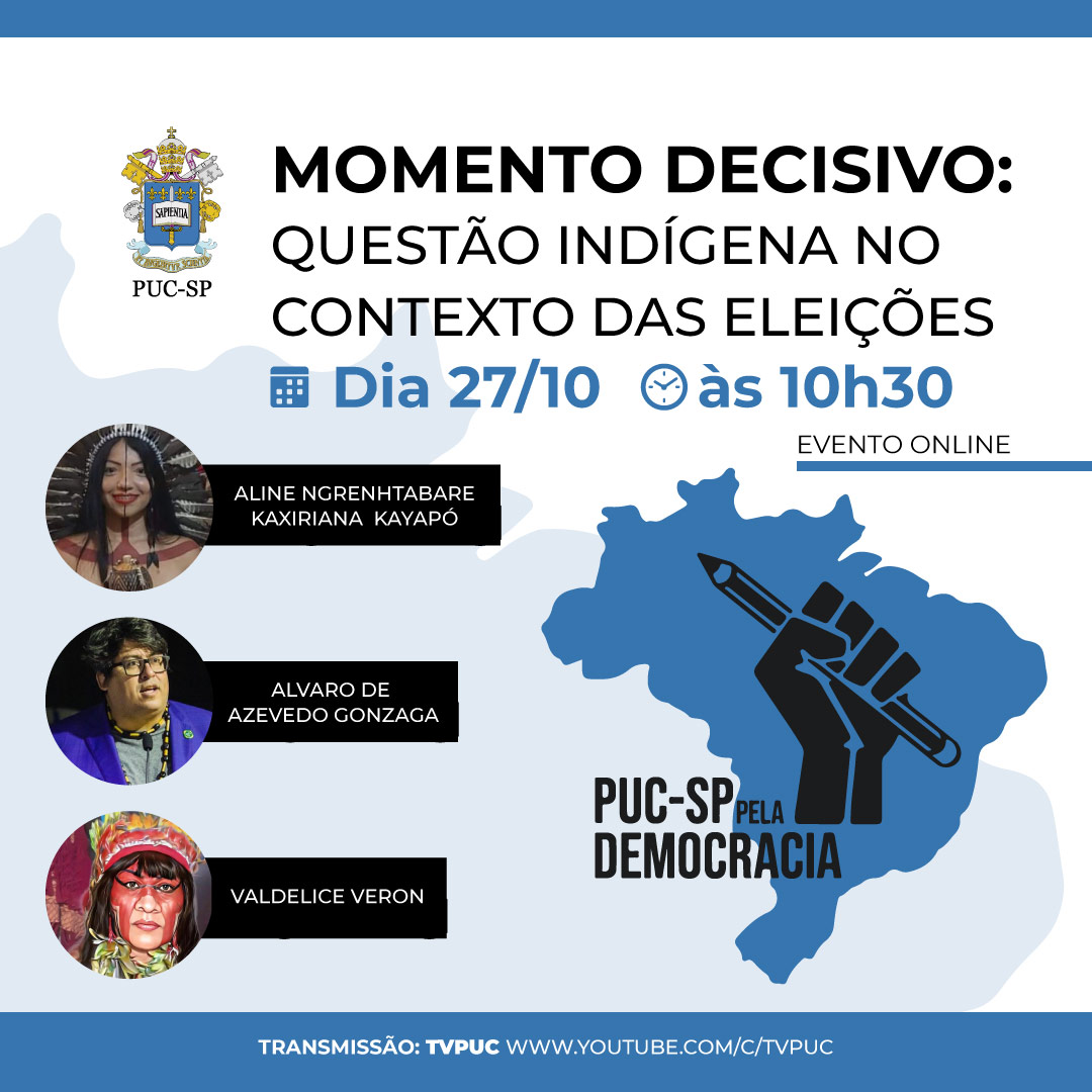 Amanhã (27/10), às 10h30, o Movimento PUC-SP pela Democracia promove mais uma live, dessa vez com o tema "Momento decisivo: Questão Indígena no Contexto das Eleições".