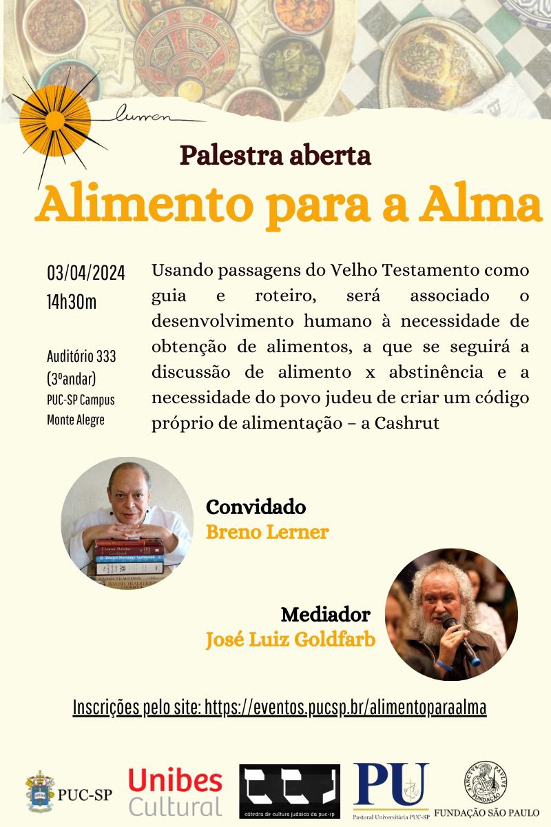 O Núcleo de Humanidades para Ciência e Tecnologia (Lumen) da Fundação São Paulo promove, no dia 3/4, das 14h30 às 16h30, a palestra aberta Alimento para a alma.