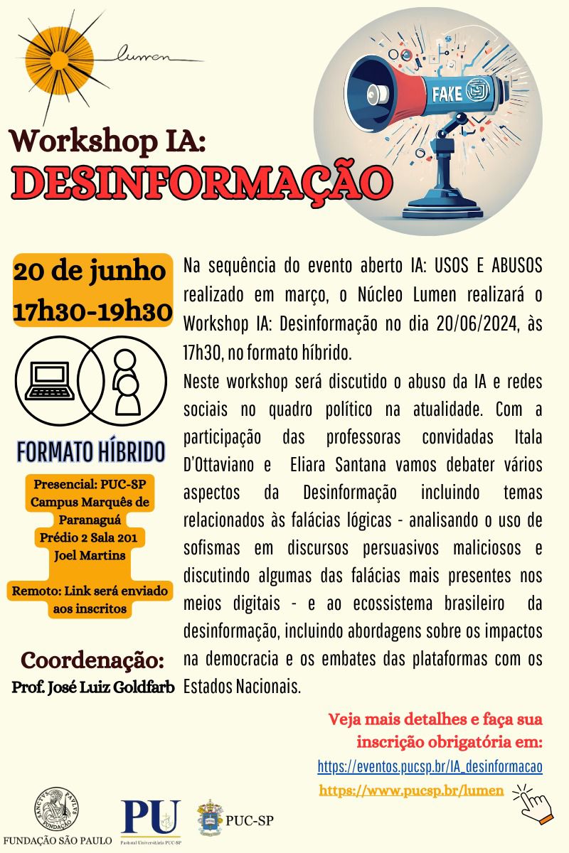 Neste workshop será discutido o abuso da IA e redes sociais no quadro político na atualidade. Com a participação das professoras convidadas Itala D’Ottaviano e Eliara Santana vamos debater vários aspectos da Desinformação incluindo temas relacionados às falácias lógicas - analisando o uso de sofismas em discursos persuasivos maliciosos e discutindo algumas das falácias mais presentes nos meios digitais - e ao ecossistema brasileiro da desinformação, incluindo abordagens sobre os impactos na democracia e os embates das plataformas com os Estados Nacionais.