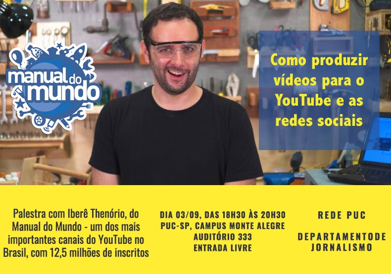 Dia 3/9, às 18h30, Iberê Tenório realiza a palestra Como produzir vídeos para o youtube e as redes sociais. Ele é criador do Manual do Mundo, canal do Brasil com mais de 12 milhões de inscritos. O evento acontece no campus Monte Alegre, auditório 333 (3º andar, prédio novo), com entrada livre. Realização: Rede PUC e Depto. de Jornalismo.