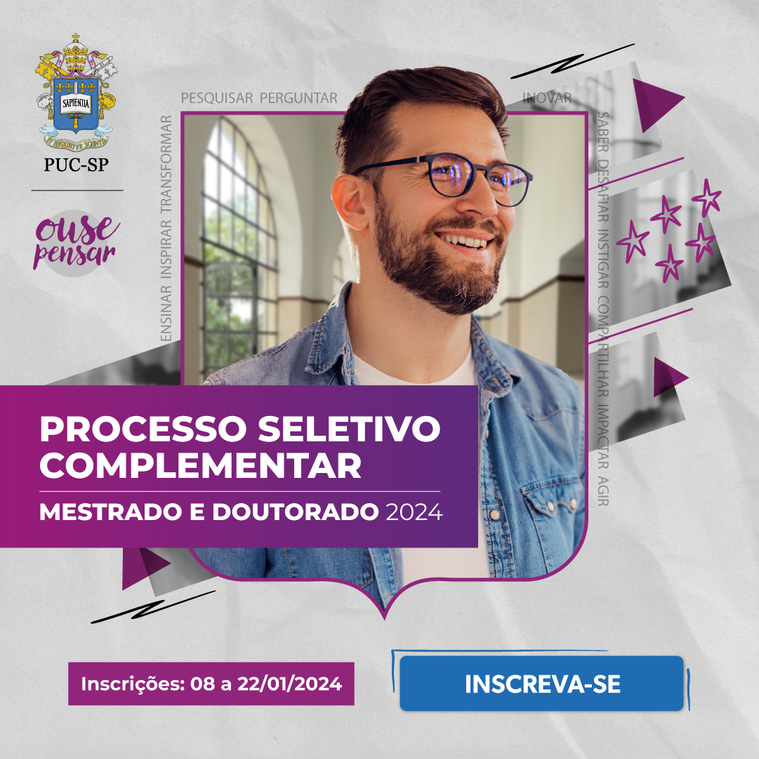 A PUC-SP está com inscrições abertas, até 22/1, para o processo seletivo complementar dos cursos de pós-graduação stricto sensu, com início no primeiro semestre de 2024. Há opções de mestrado, mestrado profissional e doutorado.