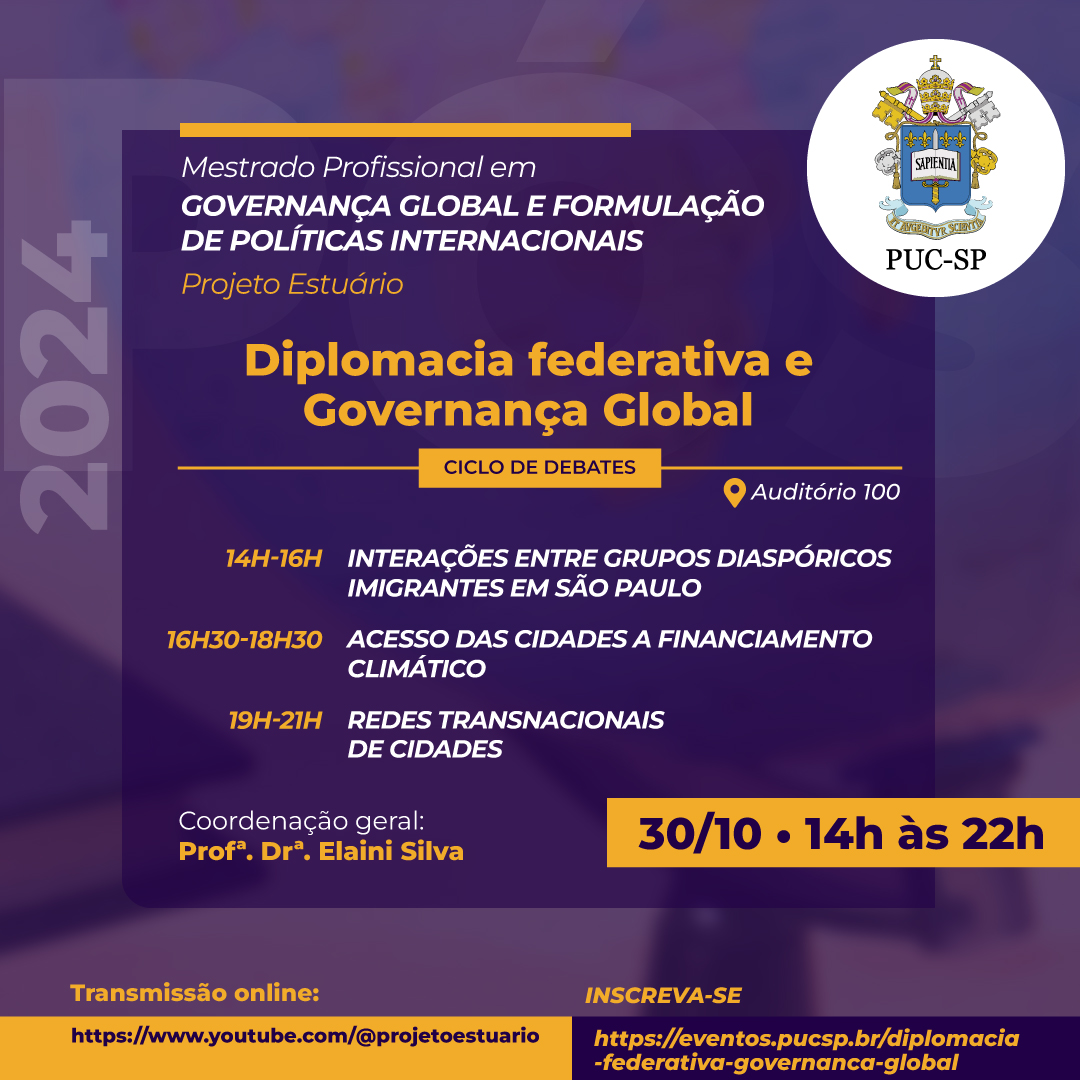 O Mestrado Profissional em Governança Global e Formulação de Políticas Internacionais convida toda a comunidade da PUC-SP para o evento Diplomacia federativa governança global, que ocorre no dia 30/10, das 14h às 22h.