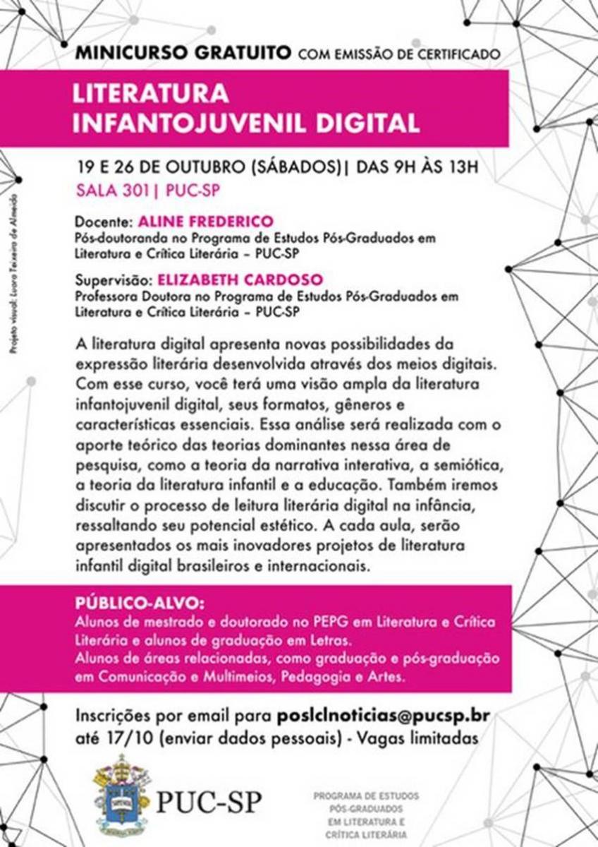 Até 17/10, é possível se inscrever para o minicurso gratuito de Literatura Infantojuvenil Digital, que será realizado nos dias 19 e 26/10, das 9 às 13h, no campus Monte Alegre. Clique aqui para obter todas as informações sobre o curso e as inscrições.