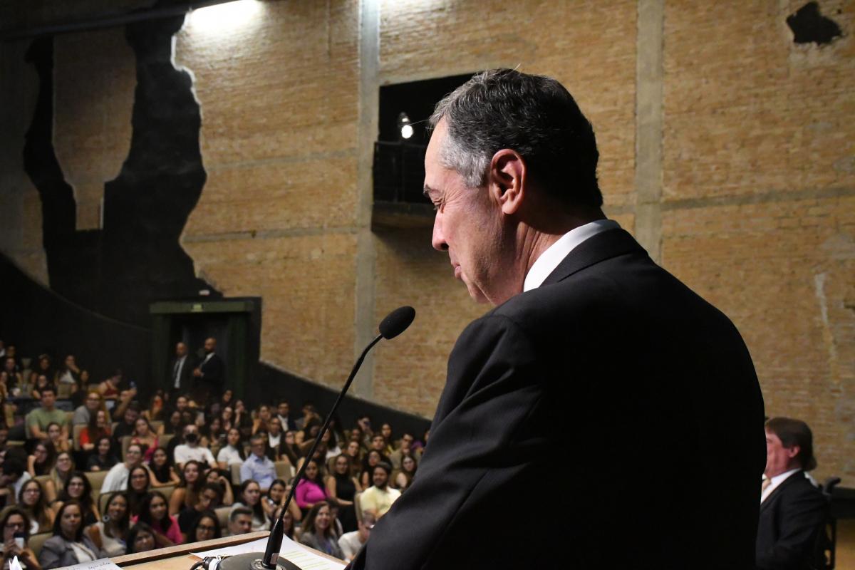 “Quero agradecer a presença do ministro presidente do Supremo Tribunal Federal e sempre professor, Luís Roberto Barroso. Se estamos aqui debatendo a democracia, é porque o STF a defendeu como valor inabalável, debelando o populismo autoritário, preservando direitos e liberdades, combatendo o abuso do poder, o arbítrio, protegendo os mais vulneráveis, como os povos indígenas e as populações quilombolas, defendendo o direito à ciência e à saúde, e como órgão guardião da Constituição, fazendo viva a Constituição, na defesa de sua força normativa. É uma honra iniciar o nosso ano com sua aula magna.”