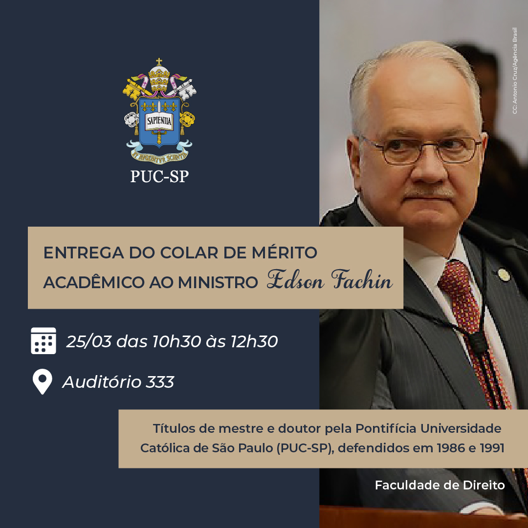 A Faculdade de Dreito concede o Colar de Mérito Acadêmico ao ministro Edson Fachin (STF), no dia 25/3, às 10h30. Fachin é mestre e doutor pela PUC-SP, defendidos em 1986 e 1999.