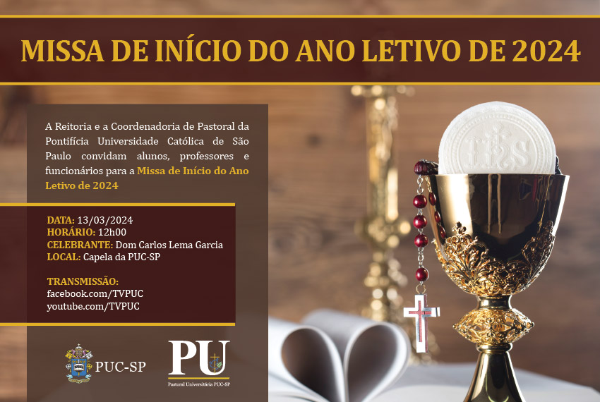 Toda a comunidade está convidada a participar da missa em ação de graças pelo início do ano letivo de 2024. A celebração será realizada em 13/3, às 12h, na Capela da PUC-SP (campus Monte Alegre).