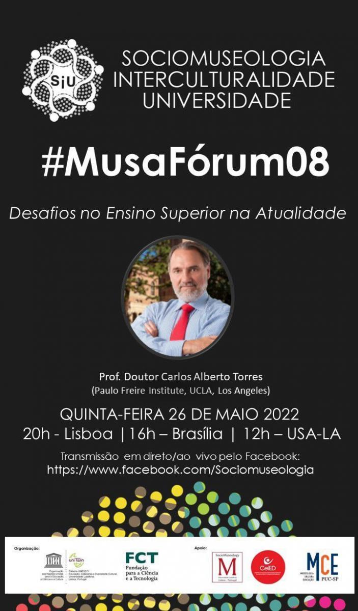 O curso de especialização em Museologia da PUC-SP é um dos apoiadores do evento #MusaFórum8, que debaterá os desafios no ensino superior na atualidade. O palestrante é o prof. Carlos Alberto Torres, diretor do Paulo Freire Institute, UCLA, Los Angeles e a mediadora é a profa. Luciana Pasqualucci (Museologia PUC-SP).