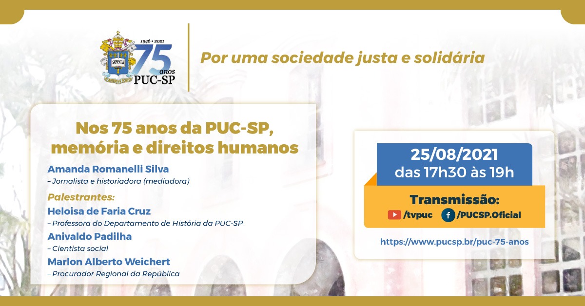 No dia 25/8, às 17h30, será realizado mais um evento das comemorações do aniversário da Universidade: a palestra Nos 75 anos da PUC SP, memória e direitos humanos. O mote geral das comemorações é Por uma sociedade justa e solidária.