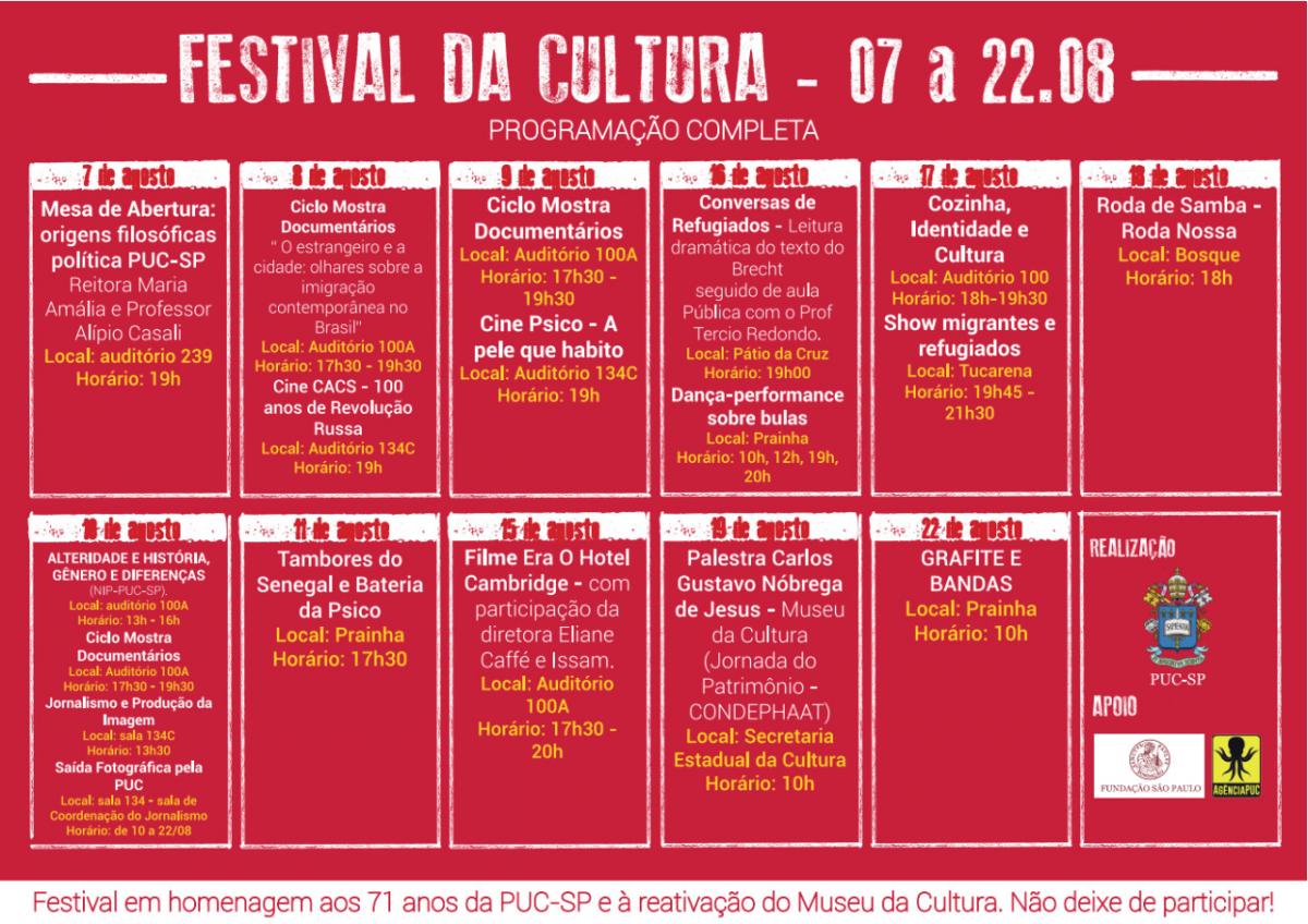 Neste sábado (19/8), dentro da programação do Festival da Cultura e da Jornada do Patrimônio (Condephaat e Conpresp) será realizada a palestra Museu da Cultura: novos olhares, com o prof. Carlos Gustavo Nóbrega de Jesus. O evento será realizado na sede da Apropuc (rua Bartira, 407), a partir das 10h, e tem entrada livre.
