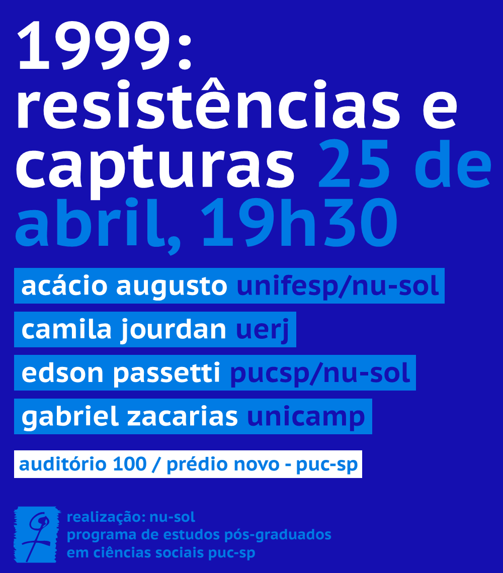 O Núcleo de Sociabilidade Libertária (Nu-Sol, Pós em Ciências Sociais) realiza o debate 1999: Resistências e Capturas, dia 25/4, às 19h, no campus Monte Alegre, auditório 100 (1º andar, prédio novo).