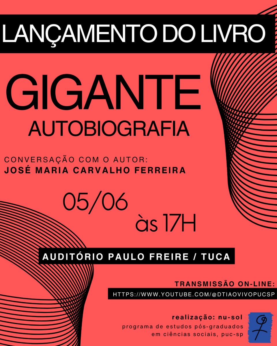 O Núcleo de Sociabilidade Libertária (Nu-Sol, Pós em Ciências Sociais) realiza o lançamento do livro Gigante – autobiografia, de José Maria Carvalho Ferreira, professor da Universidade de Lisboa.