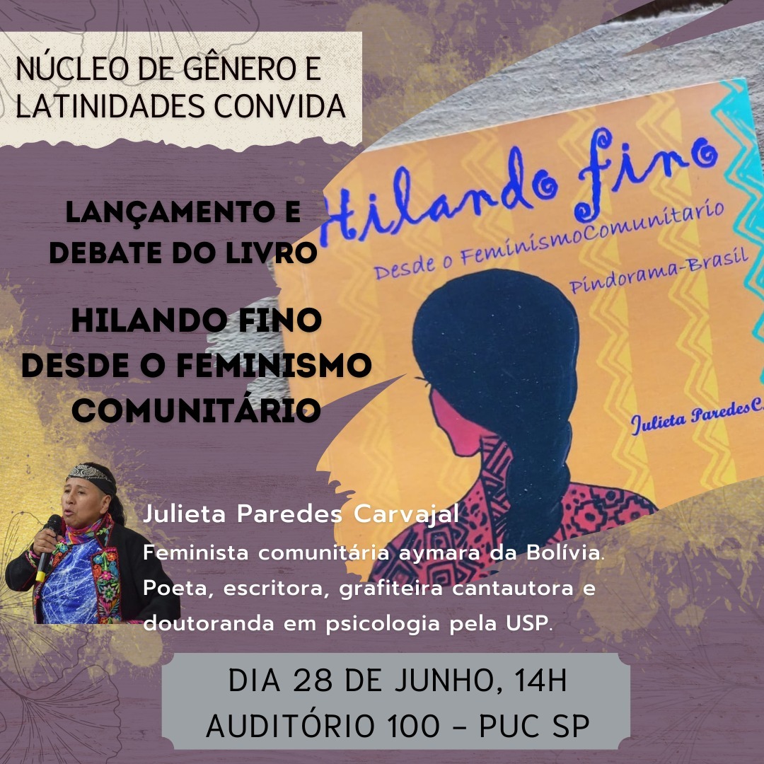 Dia 28/6, às 14h, no auditório 100 (1º andar, prédio novo, campus Monte Alegre), o Núcleo de Gênero e Latinidades (graduação em Psicologia, FACHS) lança a obra Hilando fino, desde o feminismo comunitário – Pindorama-Brasil, de Julieta Paredes Carvajal.
