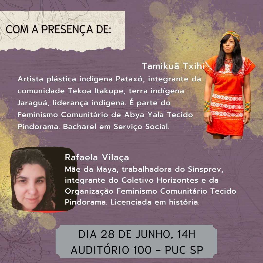 Em seguida, haverá debate com a autora, feminista comunitária aymara da Bolívia, e presenças da artista plástica Tamikuã Txihi e da historiadora Rafaela Vilaça.
