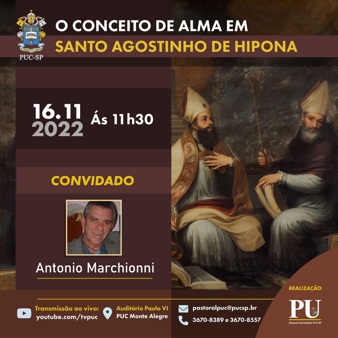 A Pastoral Universitária realiza na quarta-feira (16/11), às 11h30, a live "O Conceito de Alma em Santo Agotinho de Hipona", com o profº Antonio Marchionni.