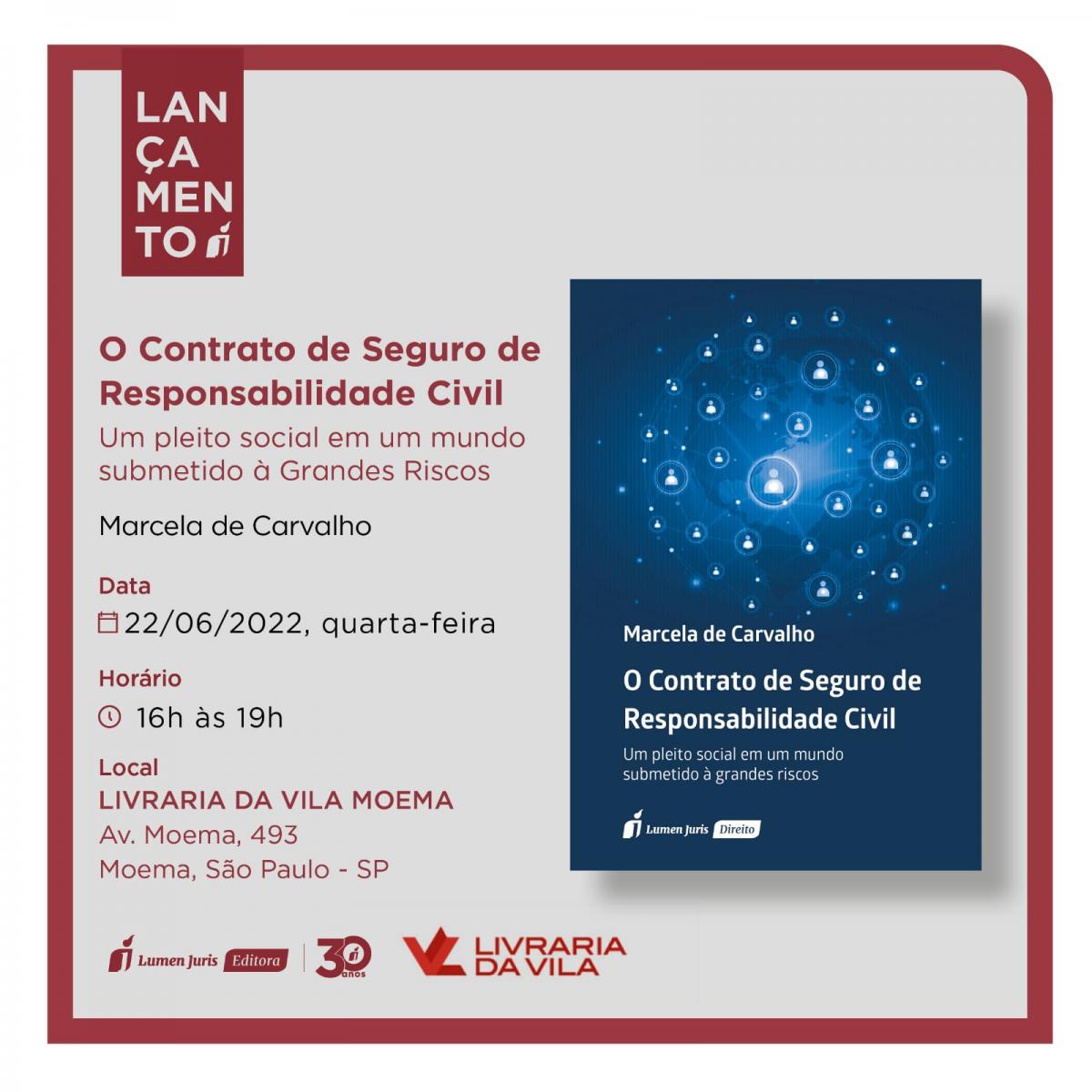 Dia 22/6, às 16h, Marcela de Carvalho lança o livro O contrato de seguro de respondabilidade civil – um pleito social em um mundo submetido a grandes riscos.