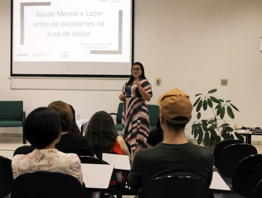 Voltando a falar sobre a importância do lazer, a profissional explicou que o propósito é “o caráter desinteressado dessa vivência” – isto é, literalmente, curtir o momento, sem ganhar nada com isso. Entre os tipos de lazer que alguém pode explorar, estão o físico-esportivo, social, artístico, manual, intelectual, virtual e turístico. Ela reconheceu que os universitários, geralmente, não têm disponibilidade de tempo. Contudo, propôs: “Será que, se você parar por 30 minutinhos, sua produtividade não será maior depois, por quebrar a rotina? Na saúde do trabalhador, isso já está comprovado. Por isso, existe a ginástica laboral”.