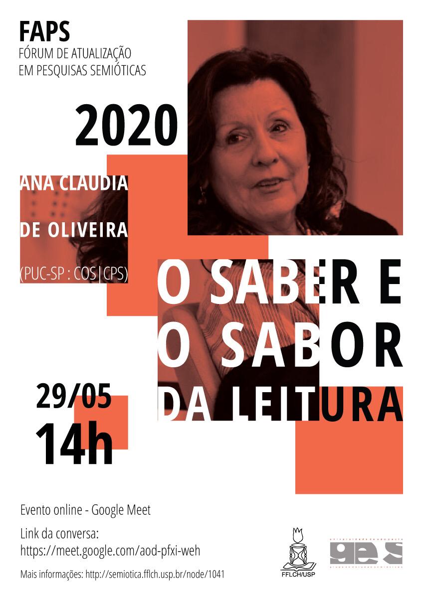 A profa. Ana Claudia de Oliveira (Pós em Comunicação e Semiótica) aborda o tema O saber e o sabor da leitura, em evento online do Fórum de Atualização em Pesquisas Semióticas.