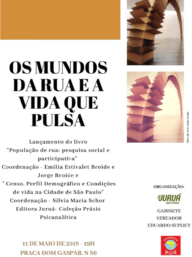 O livro População de rua: pesquisa social e participativa, do prof. Jorge Broide (Depto. de Psicologia), Emilia Estivalet Broide e Silvia Maria Schor, será lançado no dia 11/5, às 19h, na Praça Dom Gaspar, 86. A obra procura compreender de forma profunda o mundo da rua, a partir do olhar qualitativo e quantitativo. Clique aqui e saiba mais.